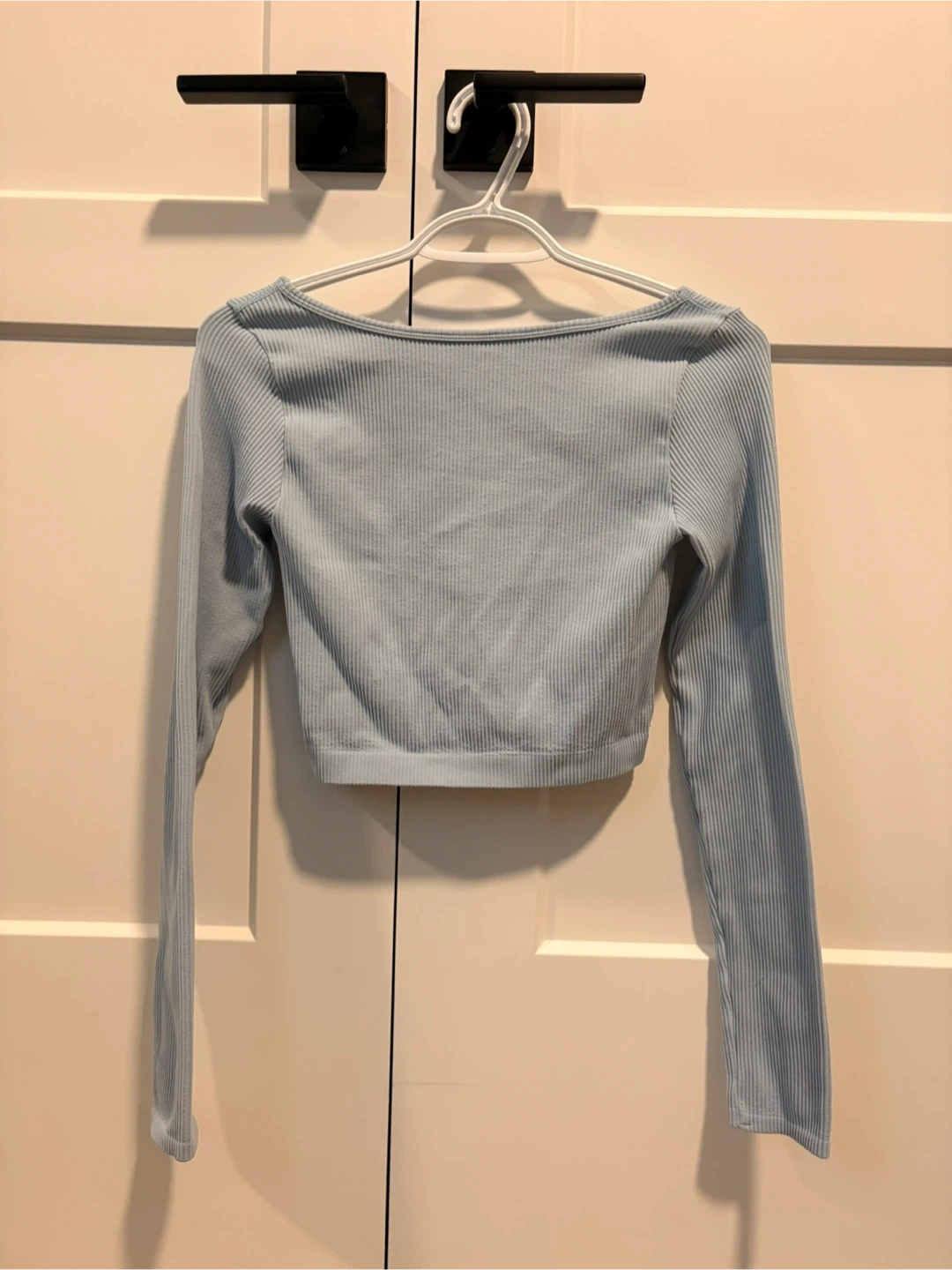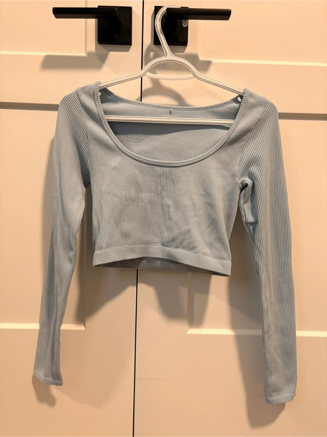This light blue ribbed long sleeve crop top is from Garage. It has a scoop neck and lettuce hem. Fabric content is 95% rayon and 5% spandex. Cash only.