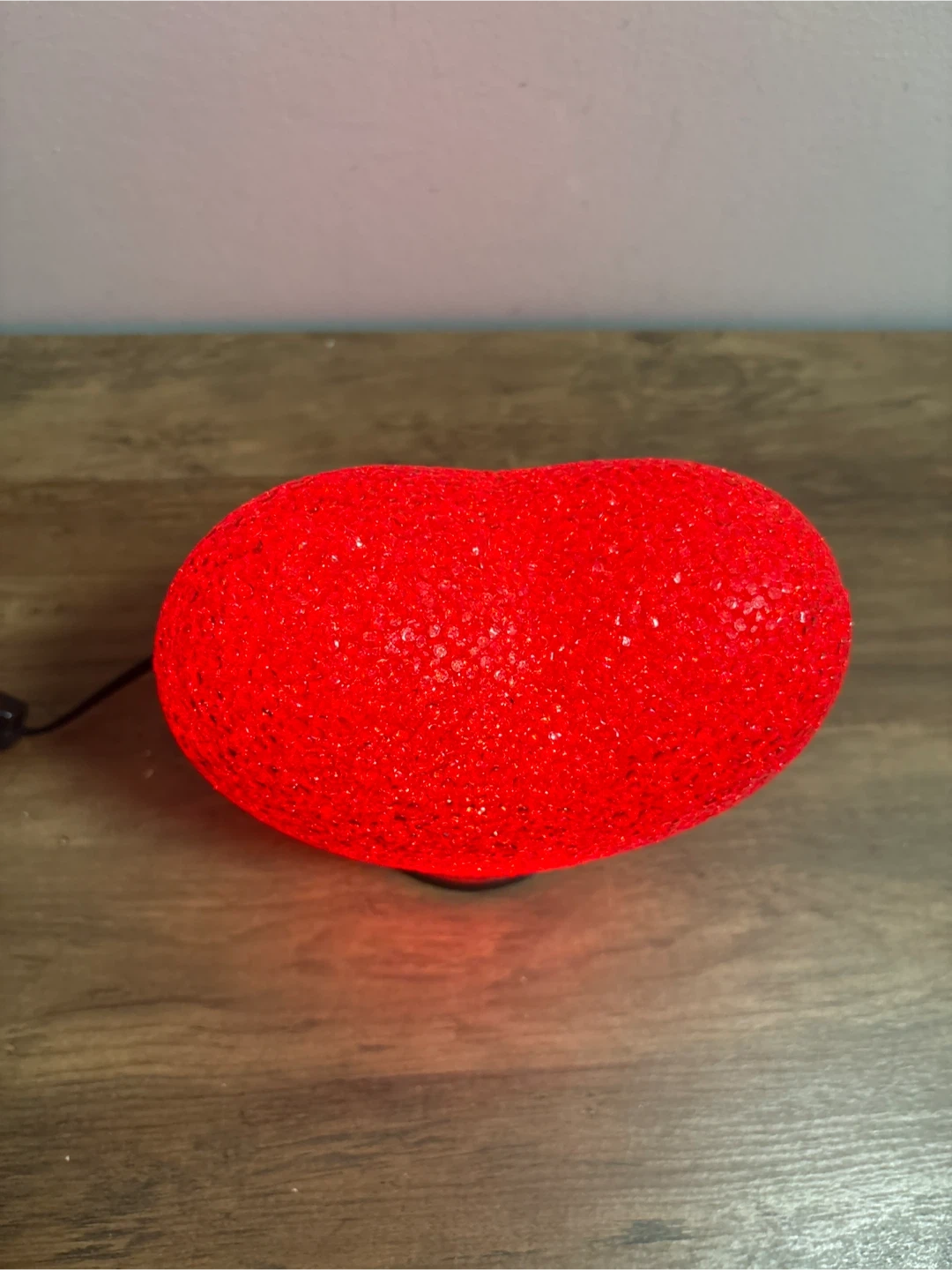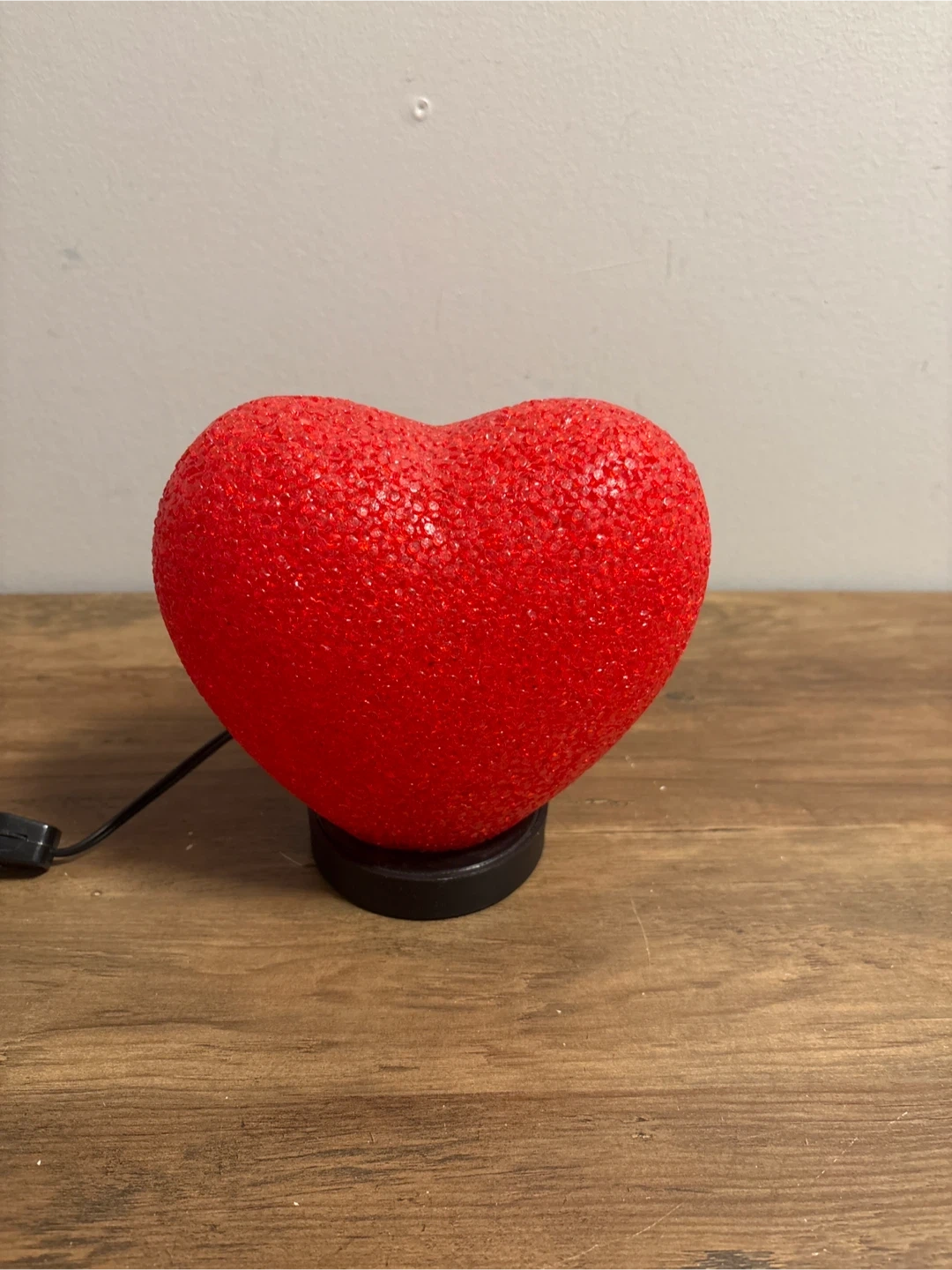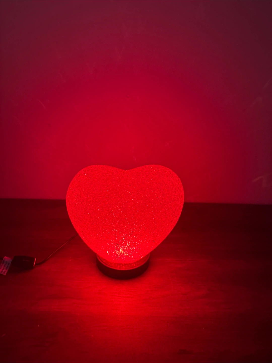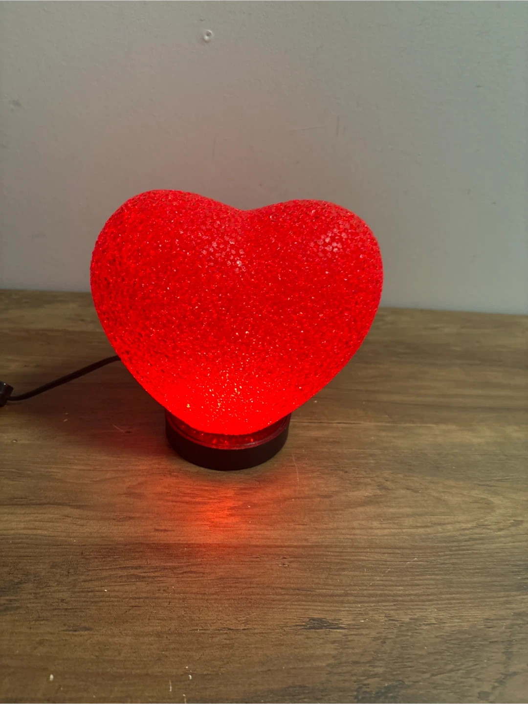 This is a fun red heart-shaped lamp. It's made of a textured plastic material and illuminates with a warm red glow. It's powered by a cord with an inline switch.
