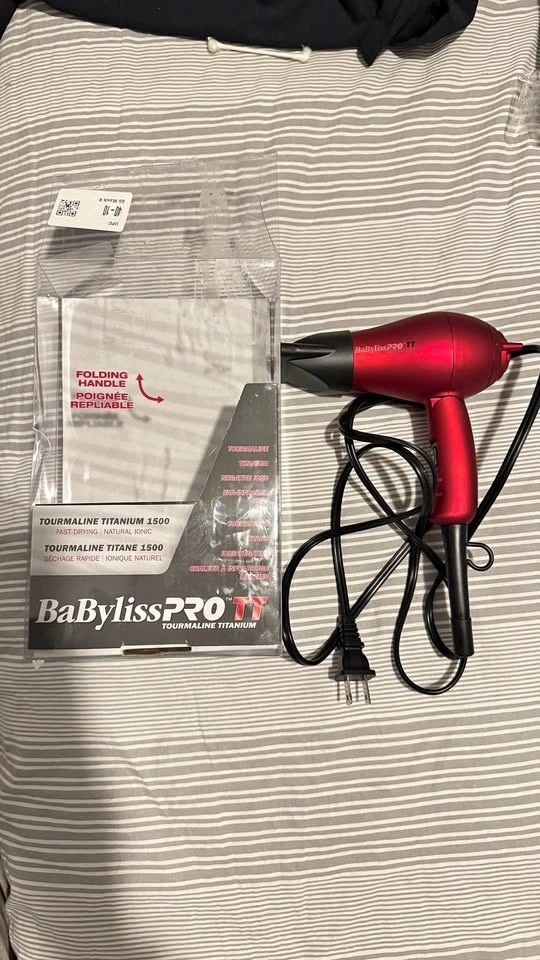 New, open box BaBylissPRO TT Tourmaline Titanium 1500 hairdryer. Red color. Has a folding handle, fast drying, natural ionic. Good for travel or home.