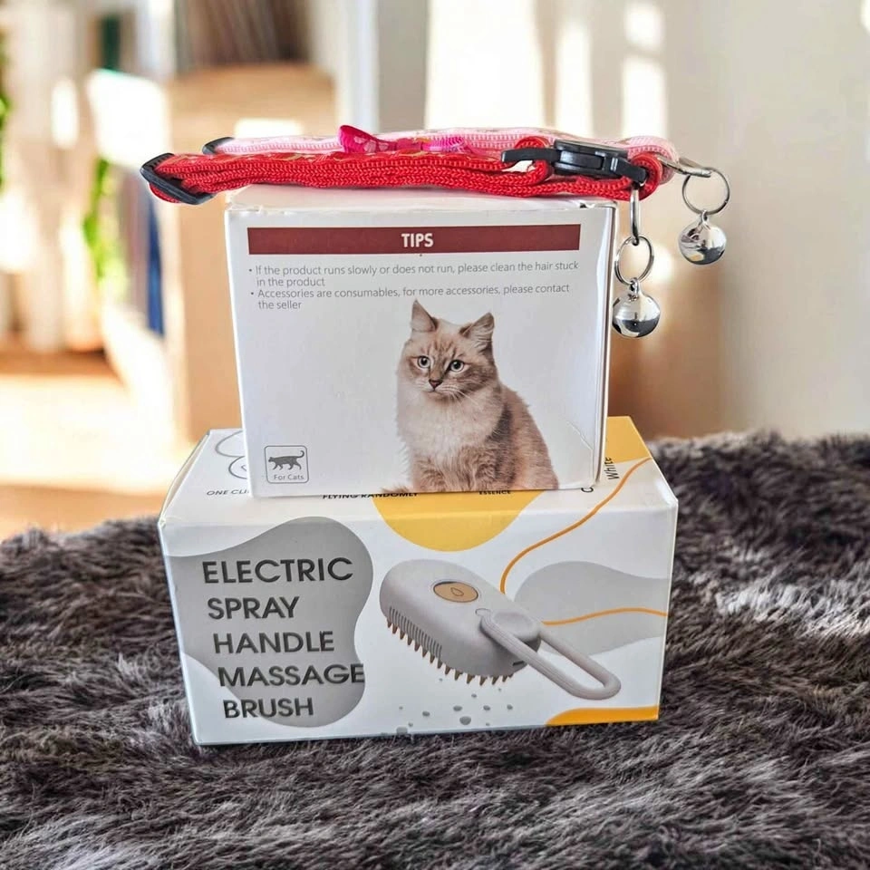 Perfect starter kit to keep your cat groomed and looking great! All items are brand new in their original packaging. Includes: Electric Steam Brush: Massages and removes loose fur with a gentle spray. Two Collars: Adjustable red and pink designs with bells. Interactive Toy: Surprise cat toy included in the box. Condition: Brand New