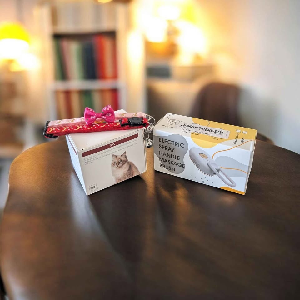 Perfect starter kit to keep your cat groomed and looking great! All items are brand new in their original packaging. Includes: Electric Steam Brush: Massages and removes loose fur with a gentle spray. Two Collars: Adjustable red and pink designs with bells. Interactive Toy: Surprise cat toy included in the box. Condition: Brand New