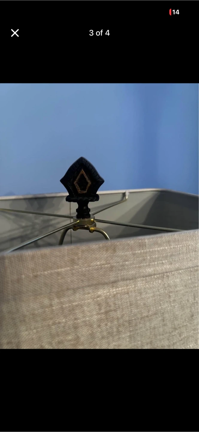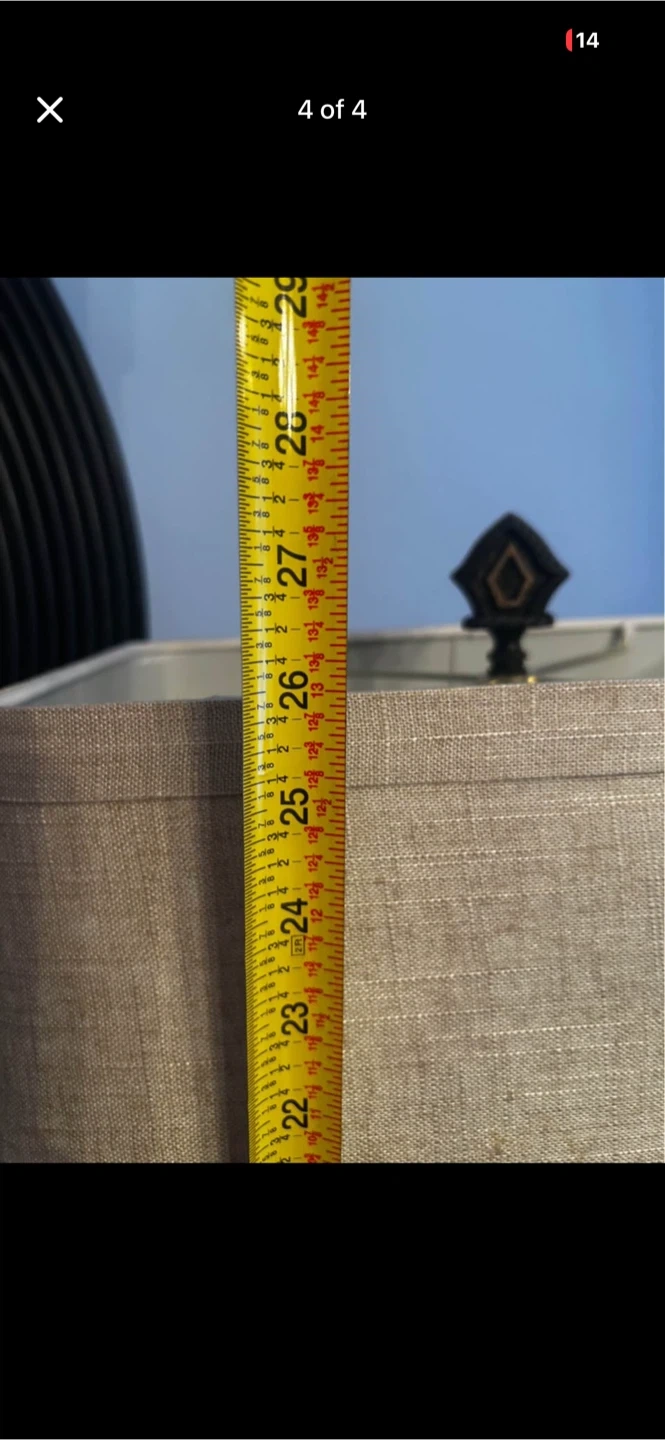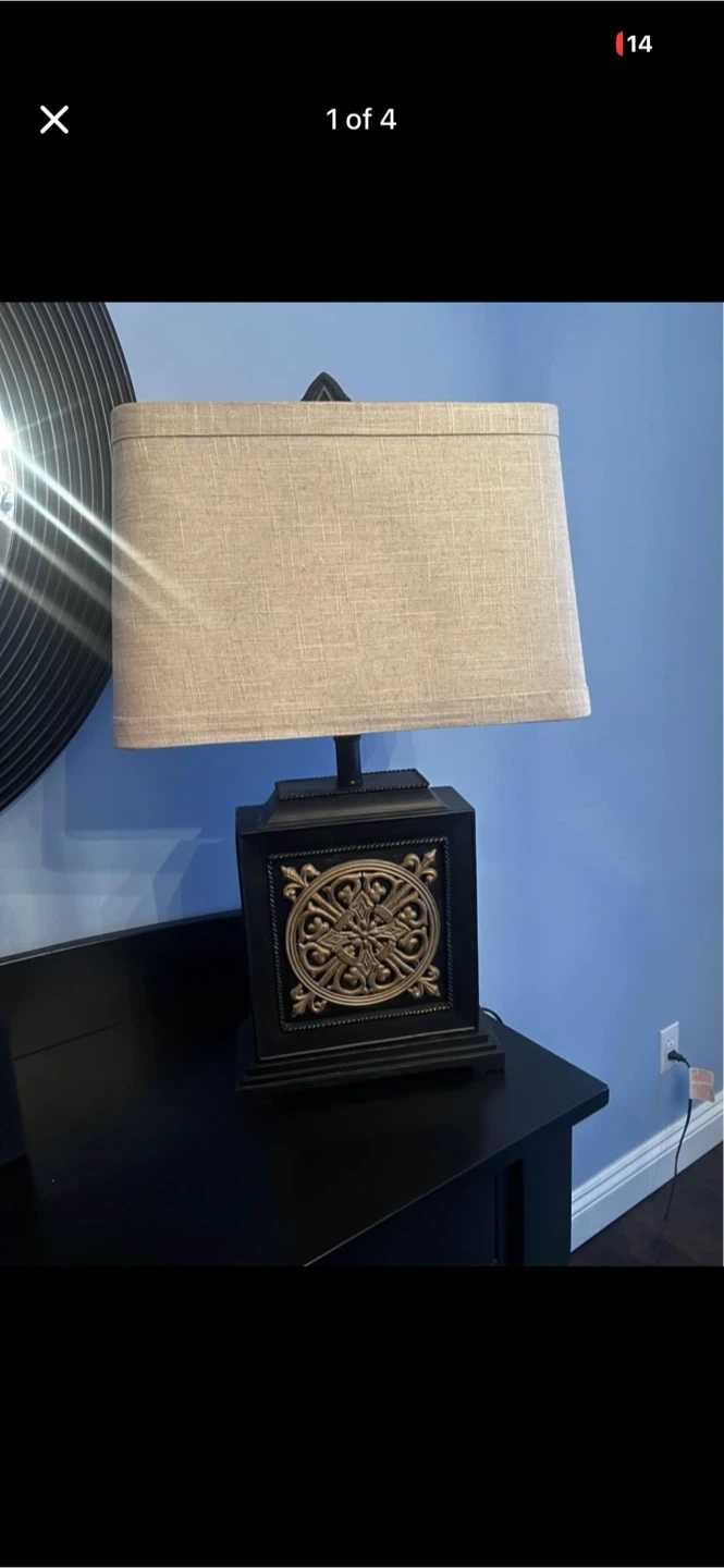 Decorative table lamp with a square base and a linen-style shade. The base features an ornate gold-tone medallion. It's approximately 27 inches tall. Adds a touch of classic style to any room.