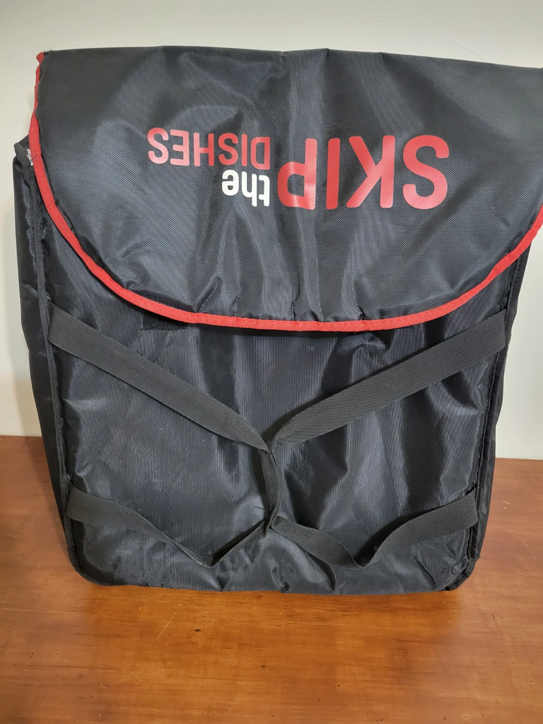 Selling a Skip The Dishes delivery bag! It's black with red trim and has the Skip The Dishes logo on the front. Perfect for food delivery or keeping things insulated.