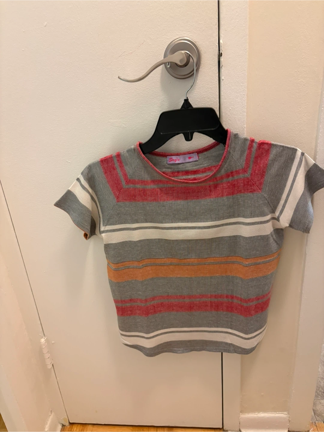 This is a cute SOO.IE knit top for girls with a grey, red, and orange striped pattern. It's a comfortable and stylish piece for everyday wear. Material is a soft knit blend.