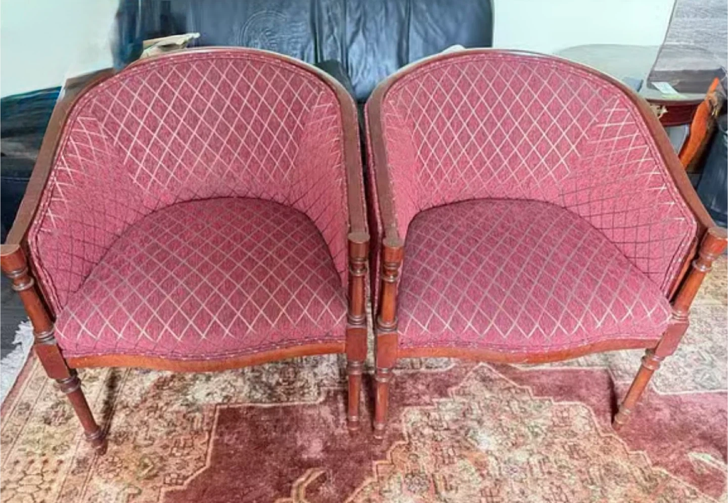 Two vintage barrel-back accent chairs with red and gold diamond pattern upholstery. Solid wood frame with turned legs. They're stylish and would add a touch of classic charm to any room. Perfect for a living room or as reading chairs.