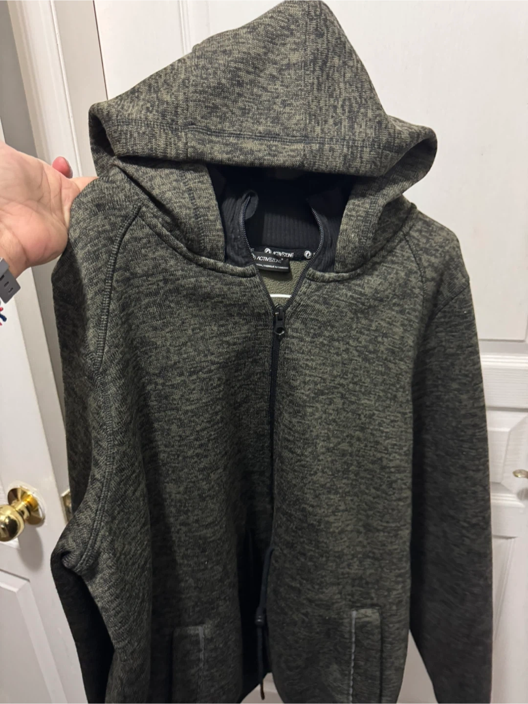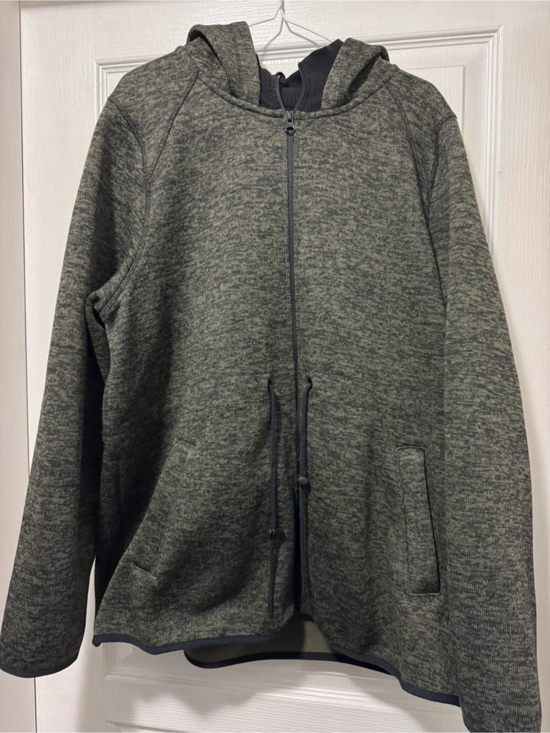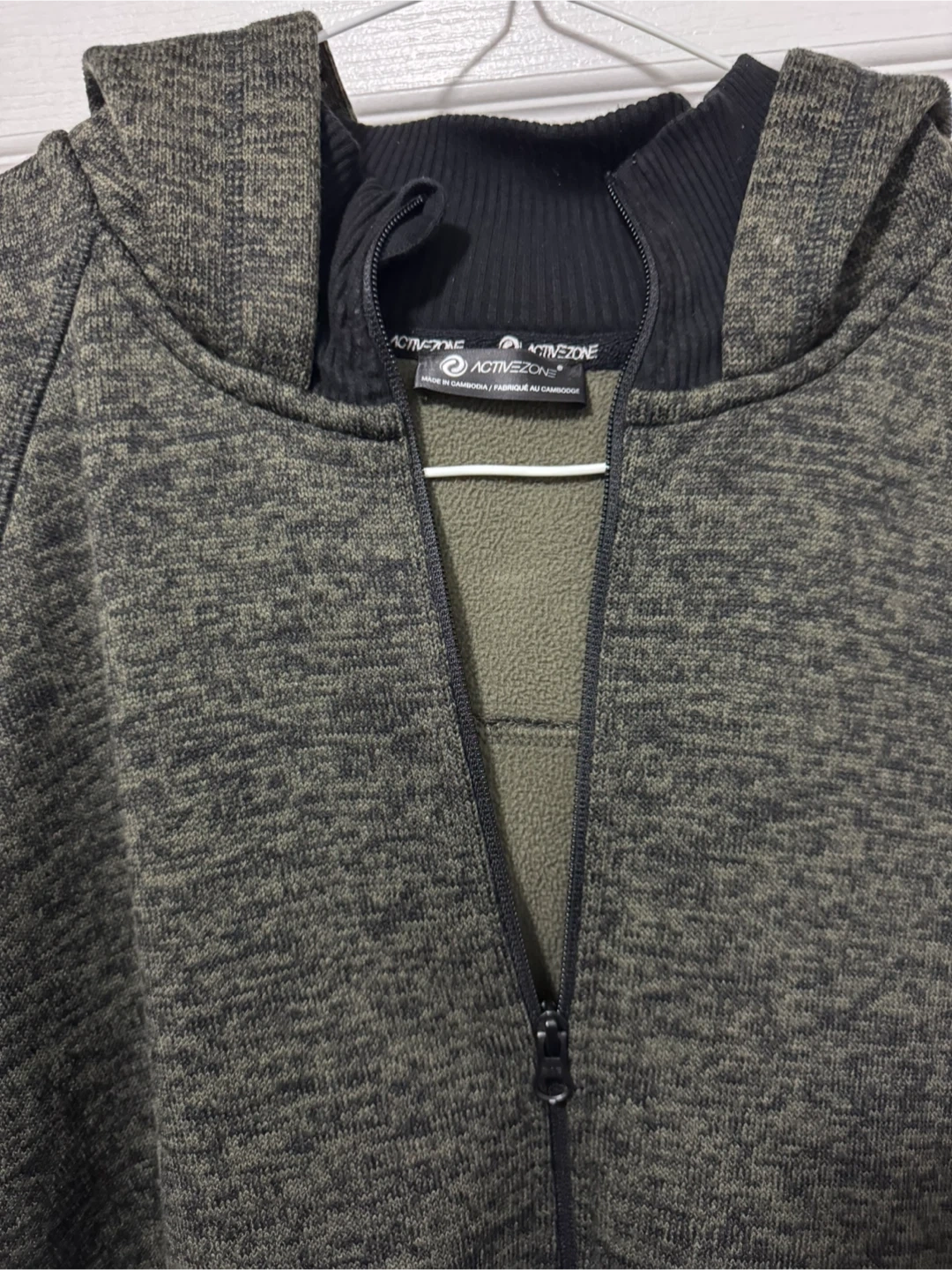 Active Zone full zip hoodie jacket in a heathered green and black pattern. It's made of a fleece material and has a drawstring hem. Perfect for staying cozy indoors or for casual wear outdoors. Keeps warm.
