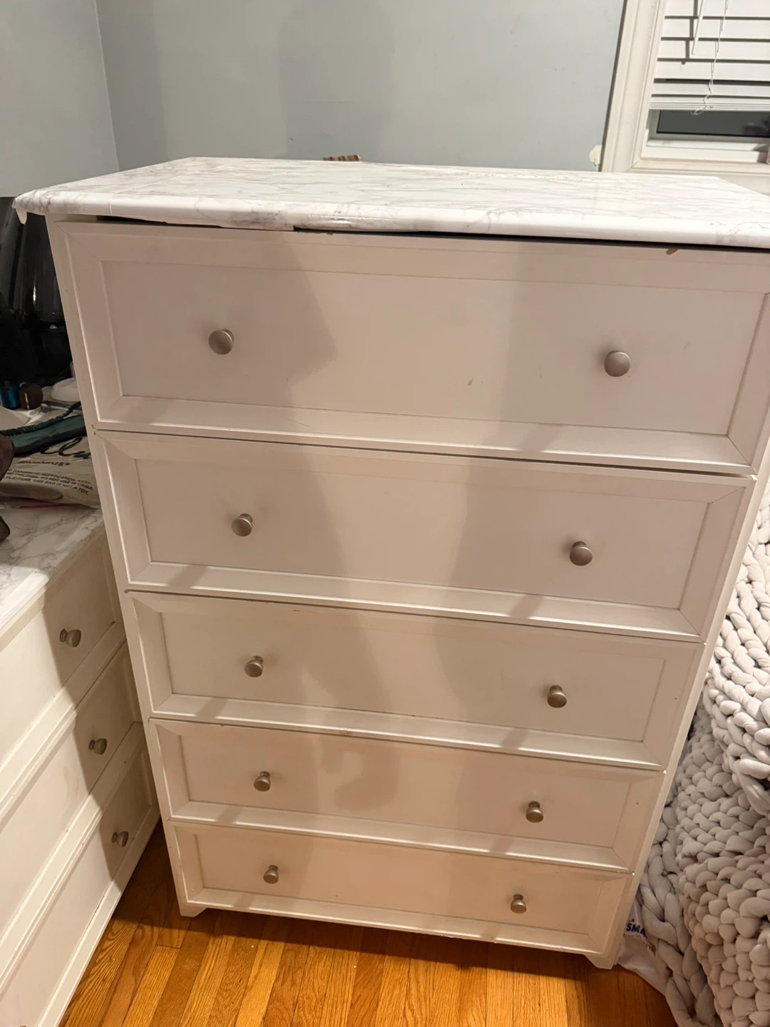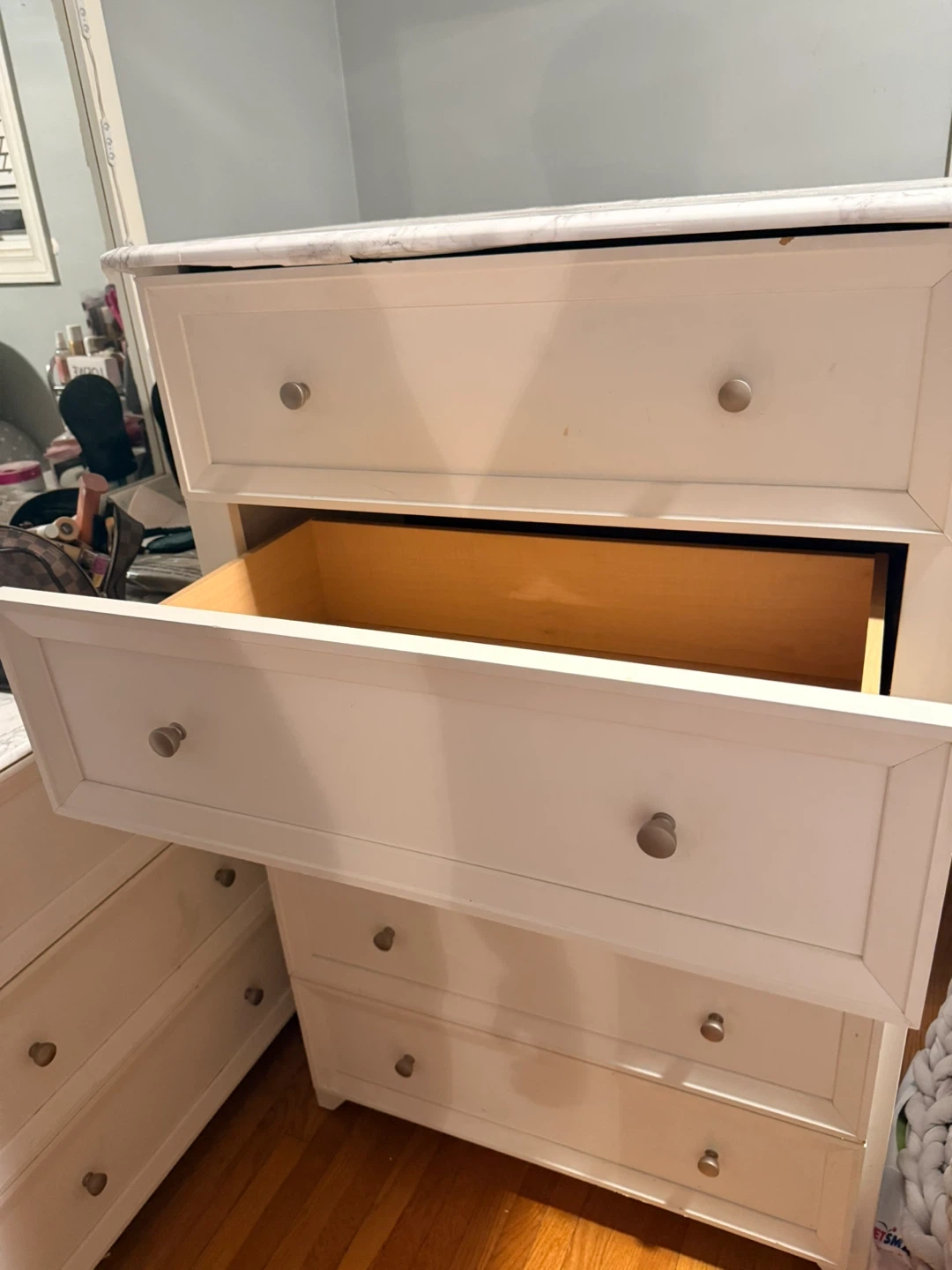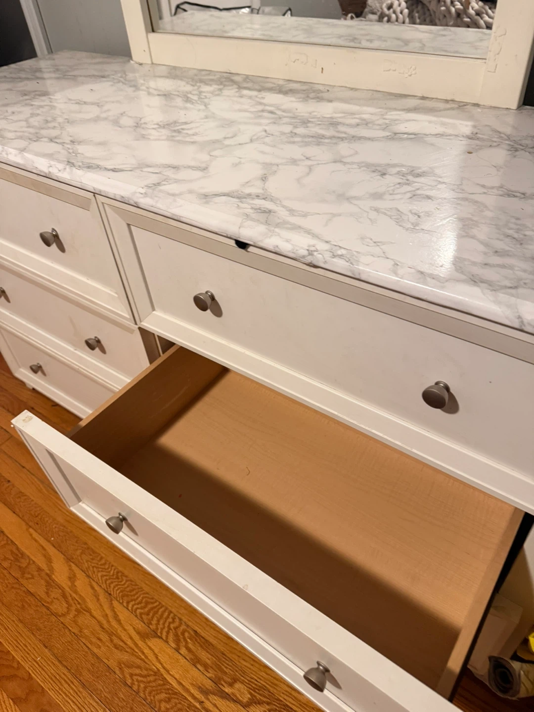 White dresser with a marble-look contact paper on the top and mirror. It's a 6-drawer dresser with silver knobs. Plenty of storage space for your clothes and belongings. Dresser dimensions are approximately 54" W x 18" D x 30" H (without mirror).