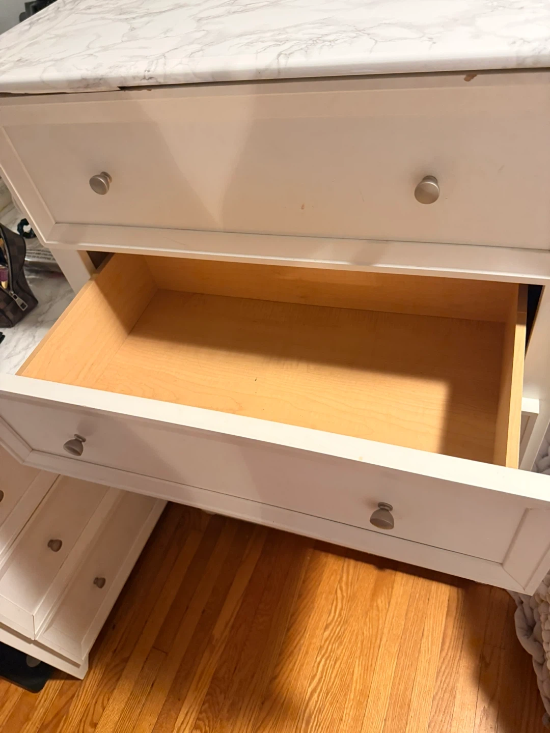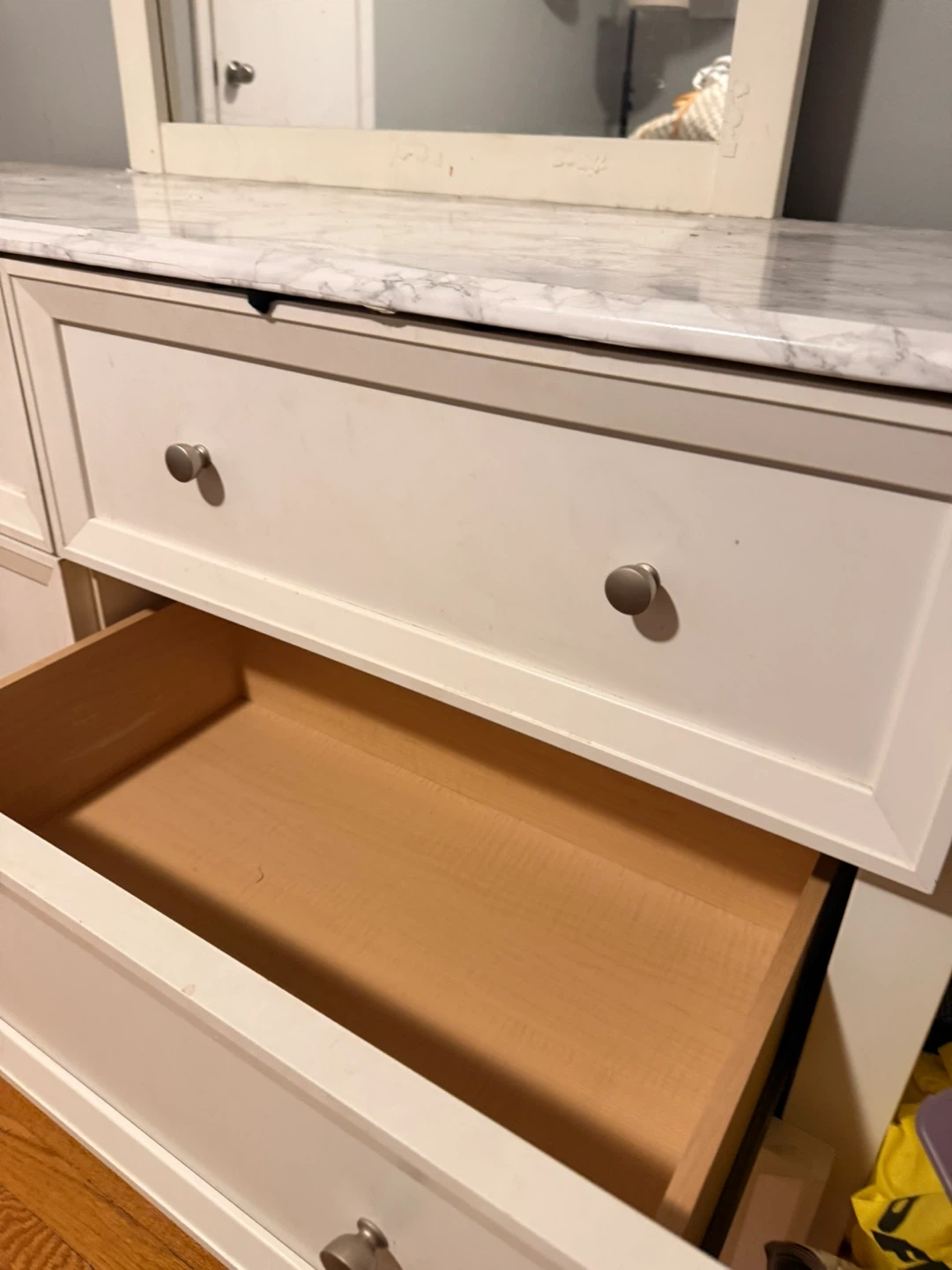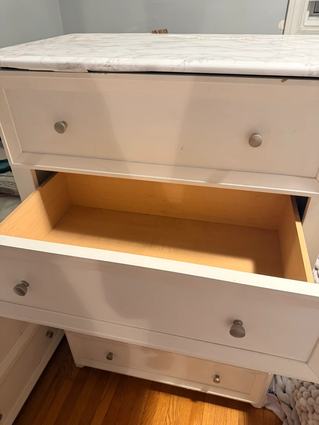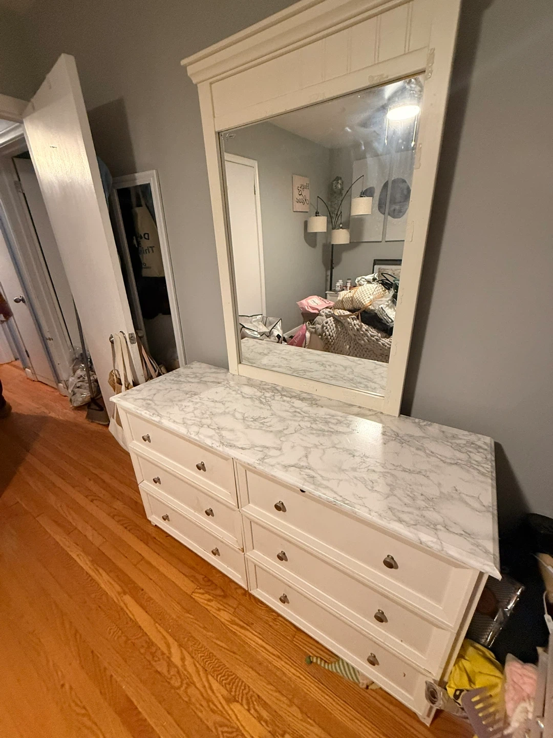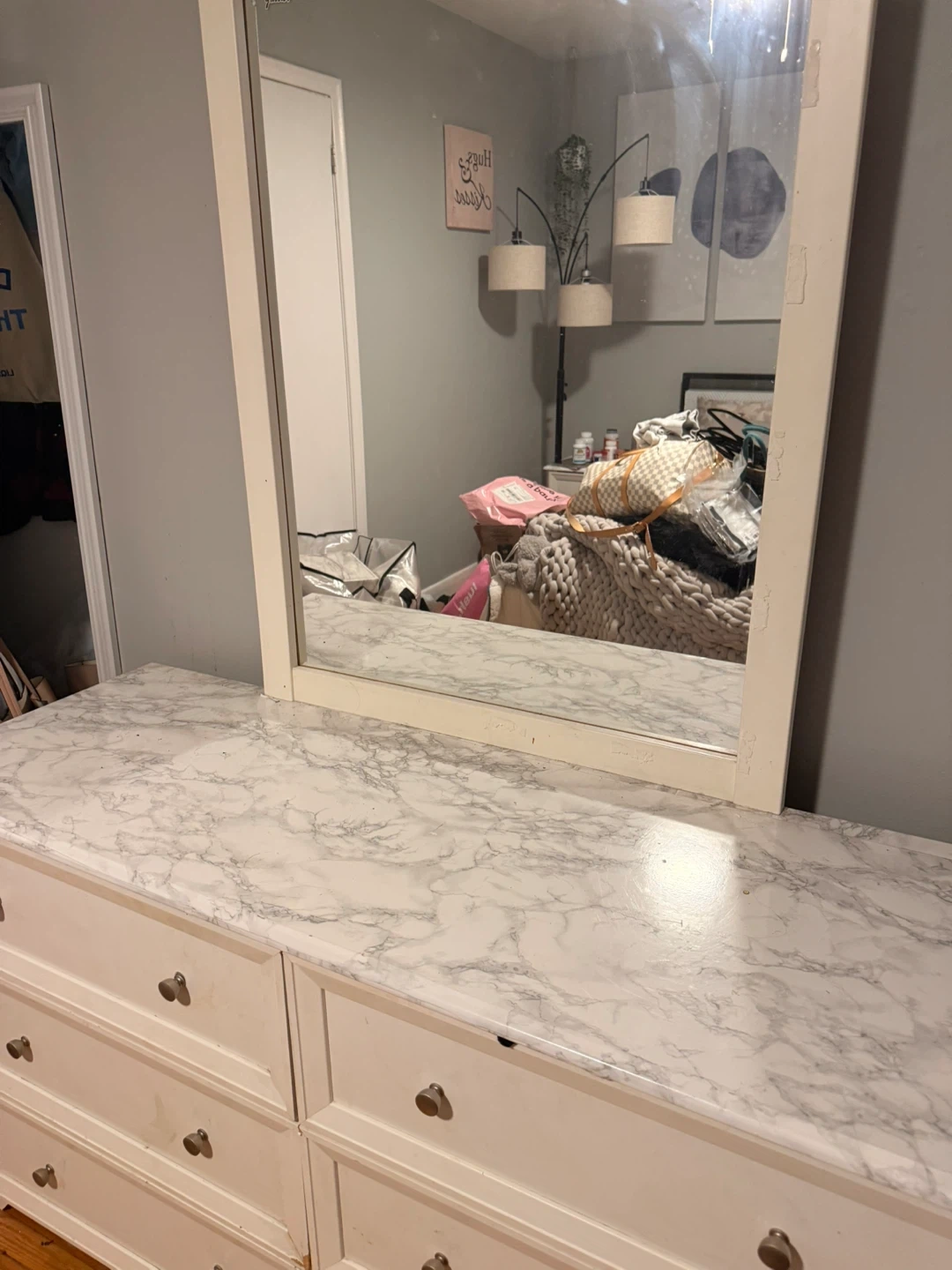 White dresser with a marble-look contact paper on the top and mirror. It's a 6-drawer dresser with silver knobs. Plenty of storage space for your clothes and belongings. Dresser dimensions are approximately 54" W x 18" D x 30" H (without mirror).