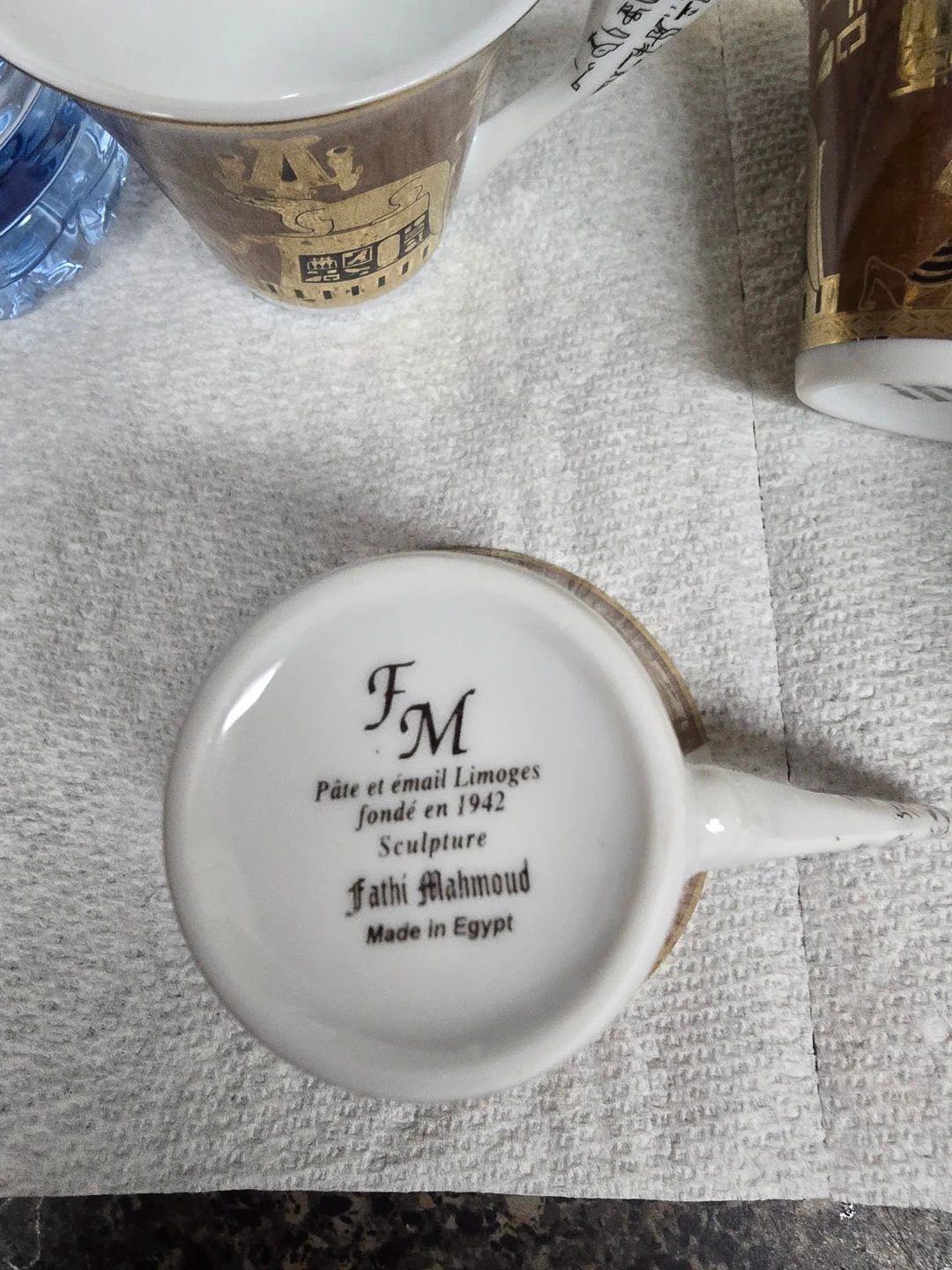 Set of five espresso cups from Fathi Mahmoud, made in Egypt. Features "Pâte et email Limoges fondé en 1942" detailing. These cups have a beautiful Egyptian-inspired design with gold accents.