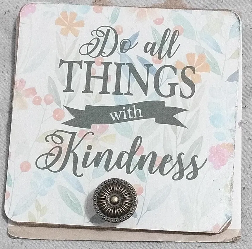 This decorative sign features the inspiring phrase "Do all THINGS with Kindness". It has a floral background and a small decorative knob. It's a lovely accent piece for any room.