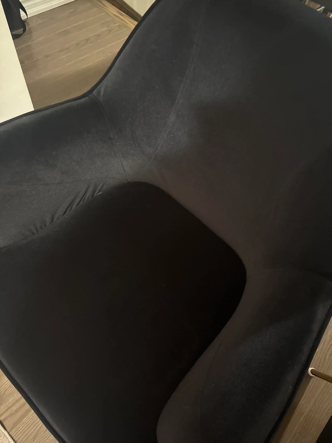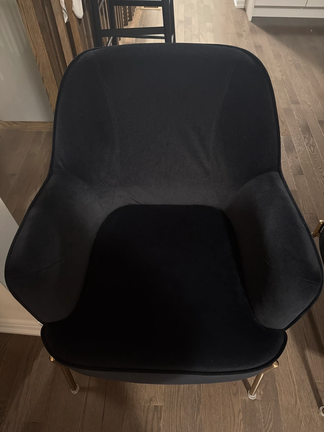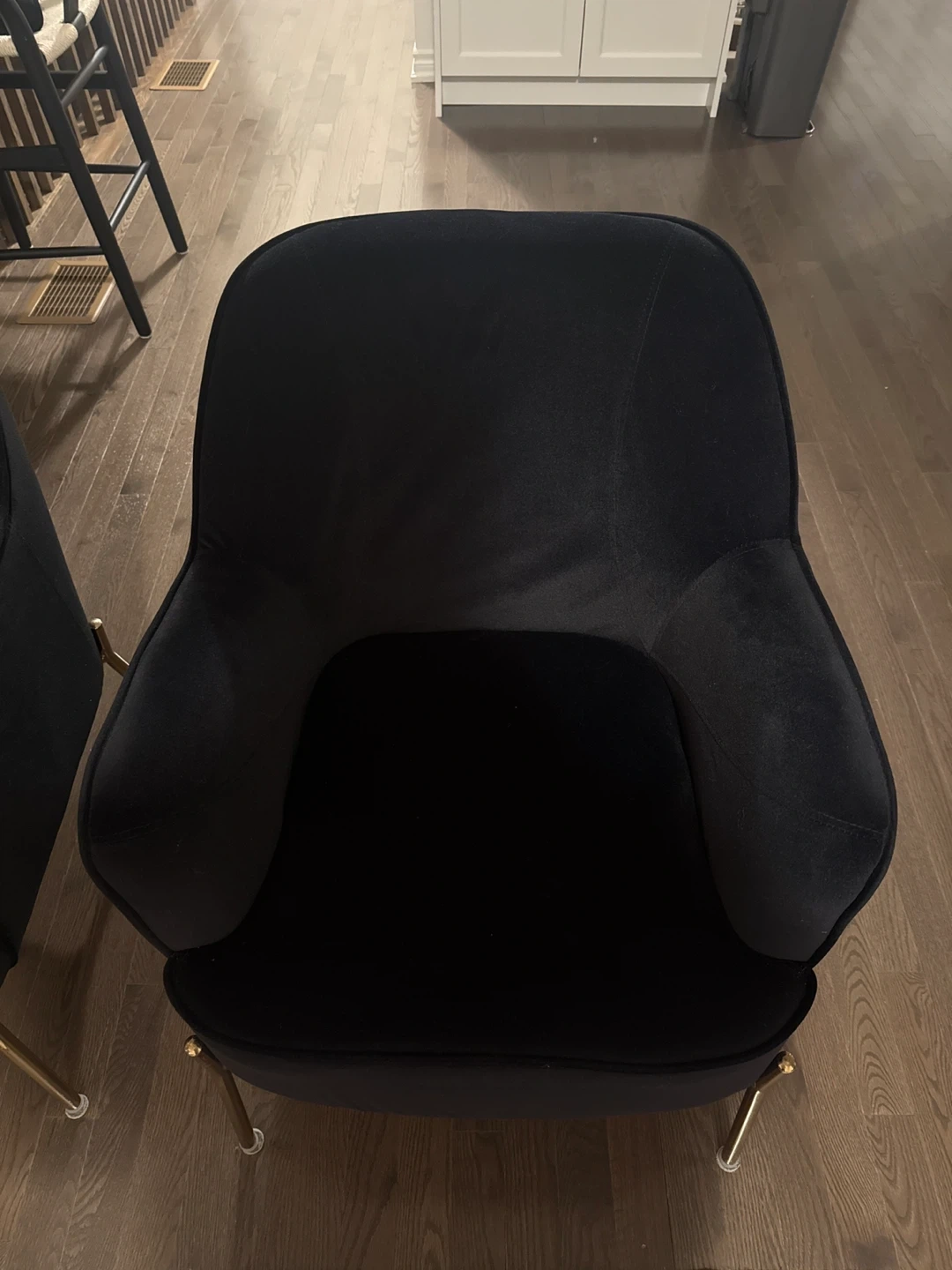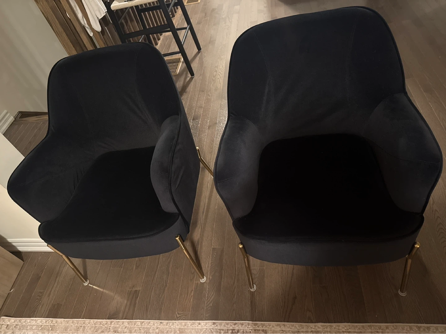 Selling a beautiful set of two black suede chairs that bring a touch of elegance and sophistication to any space. Upholstered in soft, luxurious suede, these chairs are complemented by sleek gold-tone legs that add a modern and stylish accent. Perfect for a living room, bedroom, or office, they offer both comfort and visual appeal. Gently used and well maintained, they’re a great addition for anyone looking to elevate their décor.