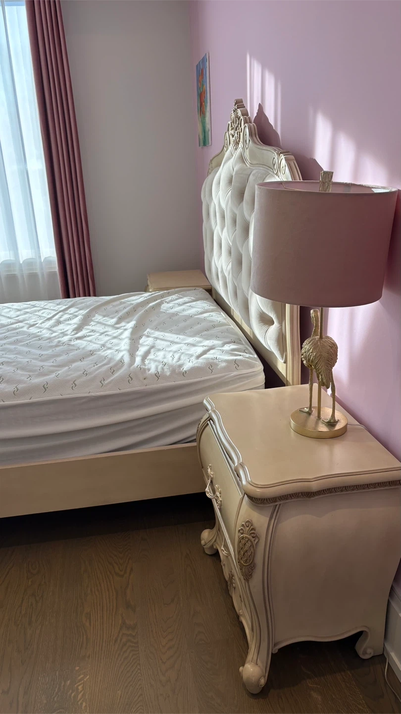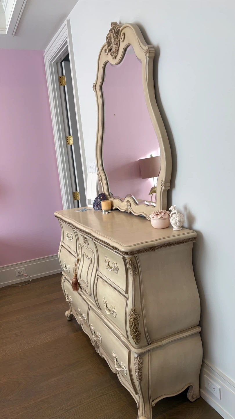 Elegant French Provincial style bedroom set. Includes a tufted headboard bed frame and a matching dresser with ornate carvings and gold accents. The colour is a classic cream or off-white with distressed detailing. This set would be a beautiful addition to a master bedroom or a princess-themed room!