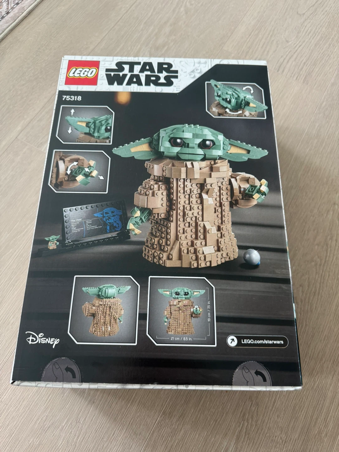 Selling a LEGO Star Wars set, The Child (Grogu), set number 75318! It's in great condition and ready for a new home. The box shows the dimensions as 21 cm / 8.5 in and 19 cm / 7.5 in.
