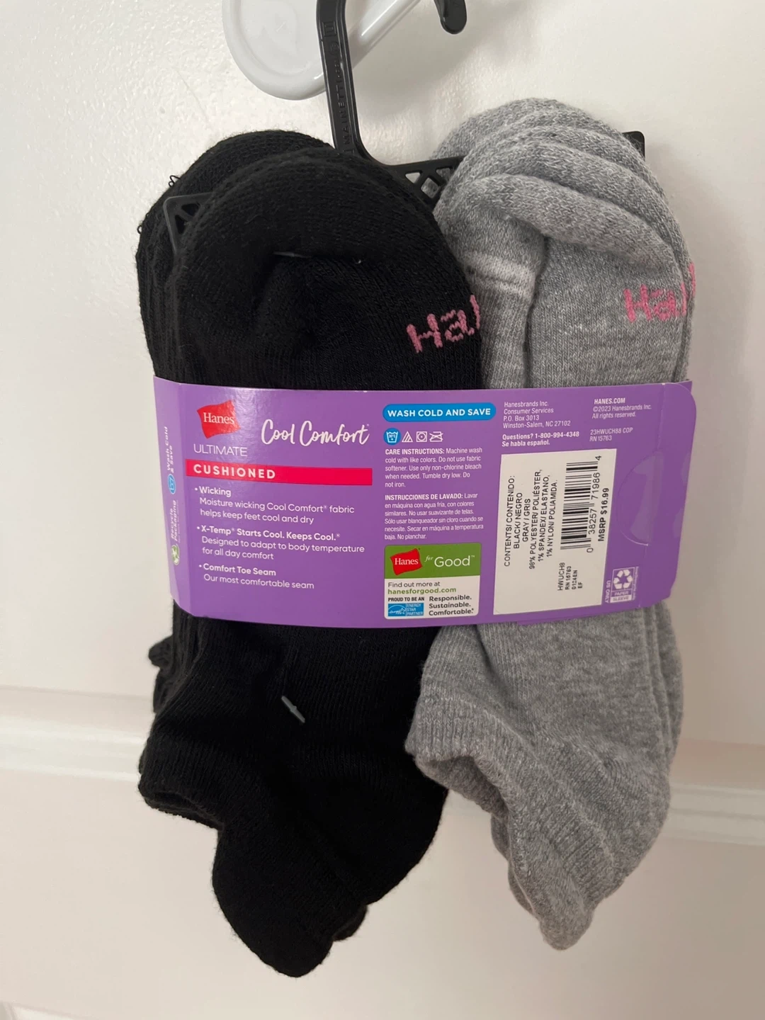 I have a pack of Hanes Ultimate Cool Comfort no show socks. These are size 5-9. They're cushioned and made with moisture-wicking Cool Comfort fabric to keep your feet cool and dry. The socks also have a comfort toe seam for extra comfort