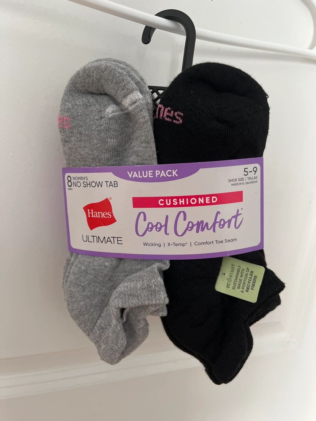 I have a pack of Hanes Ultimate Cool Comfort no show socks. These are size 5-9. They're cushioned and made with moisture-wicking Cool Comfort fabric to keep your feet cool and dry. The socks also have a comfort toe seam for extra comfort