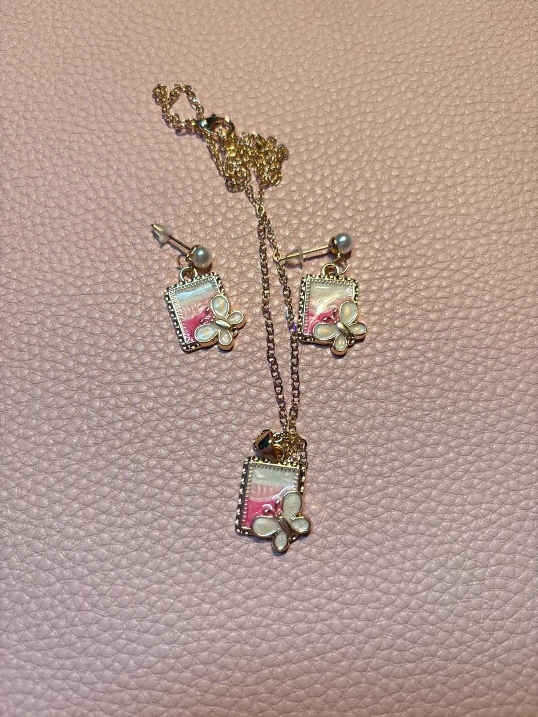 This set includes a gold tone chain necklace and a pair of matching earrings. Each piece has a small charm with a pink and white design and a white butterfly accent. It's a cute set for everyday wear!
