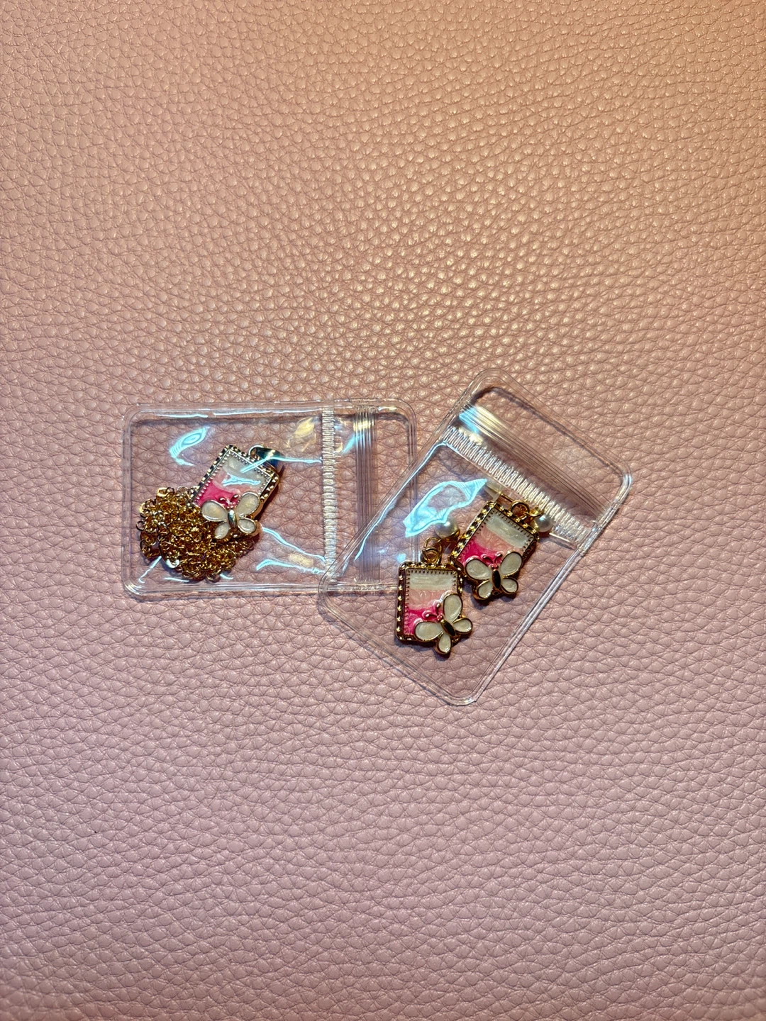 This set includes a gold tone chain necklace and a pair of matching earrings. Each piece has a small charm with a pink and white design and a white butterfly accent. It's a cute set for everyday wear!