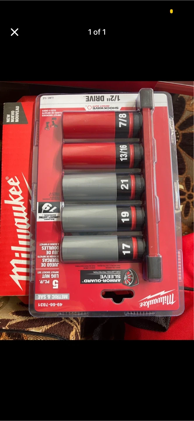 This is a new Milwaukee 5-piece 1/2" drive impact lug nut socket set. It includes metric and SAE sizes. The sockets feature Armor-Guard sleeves for lasting protection.