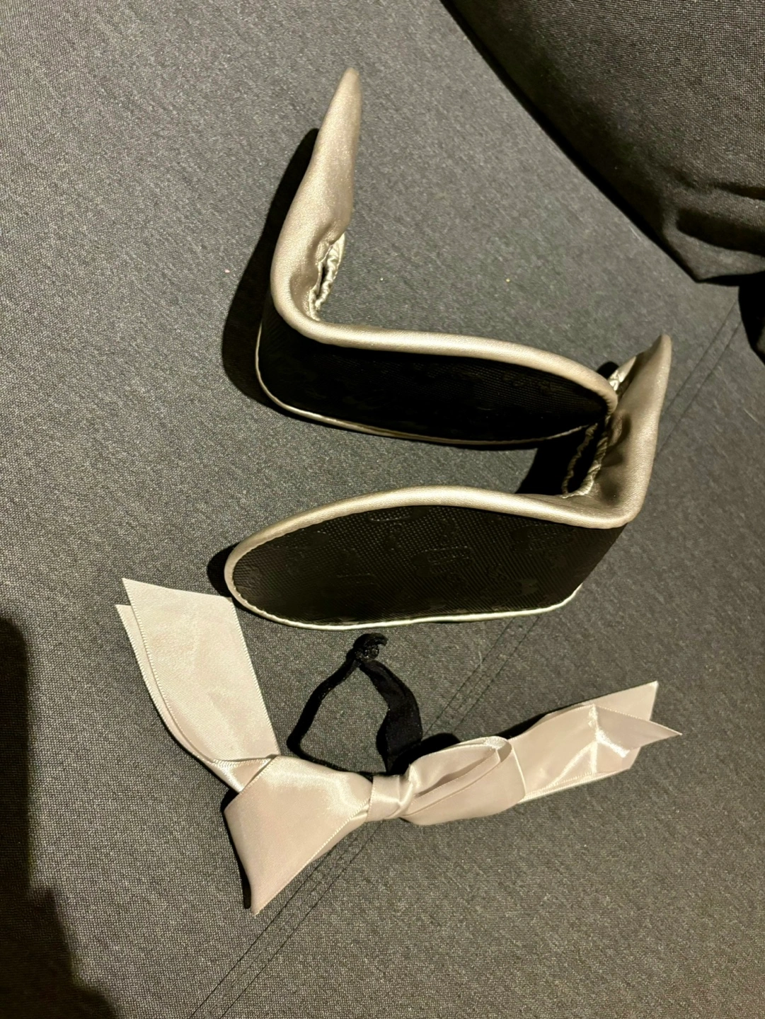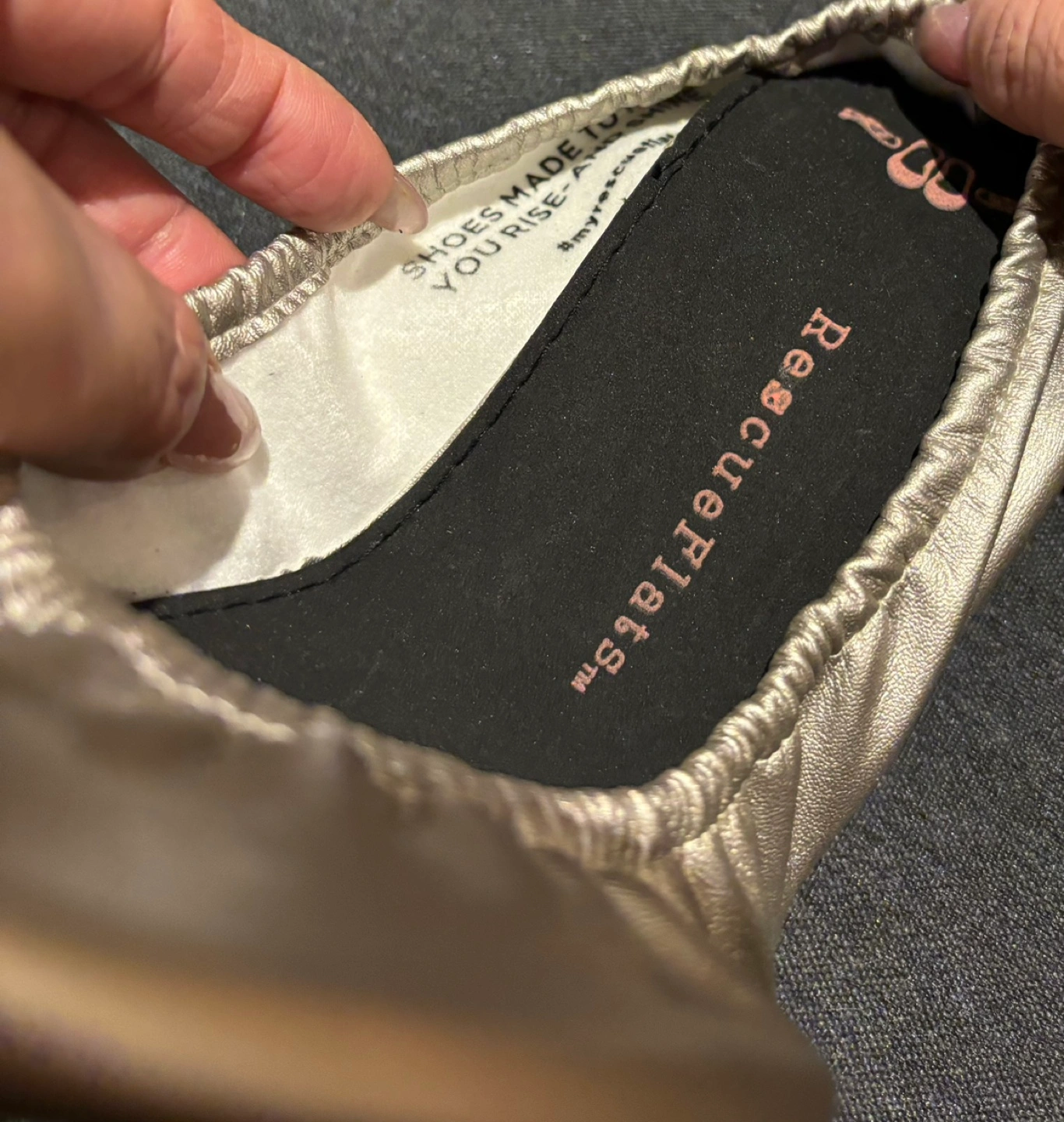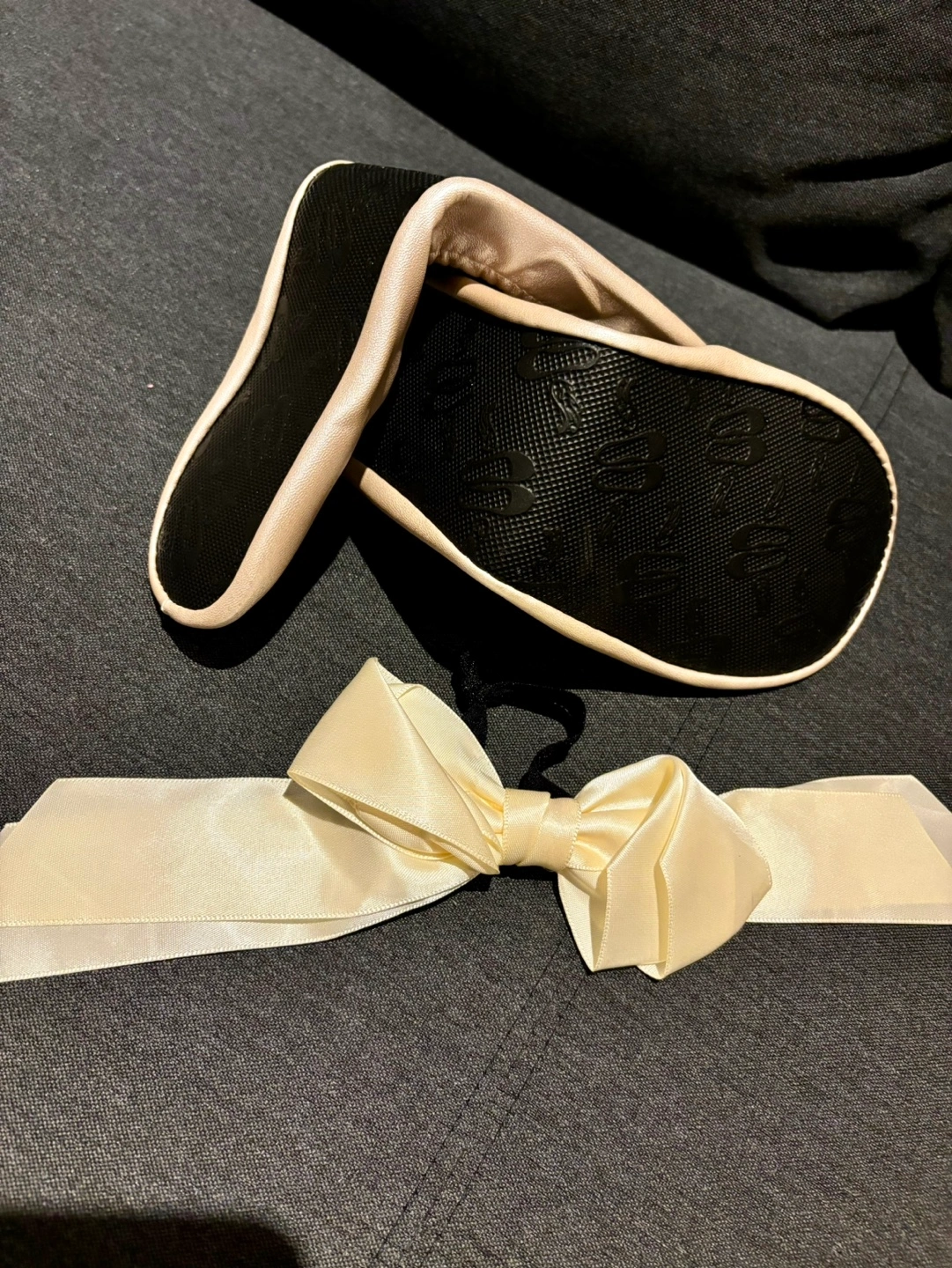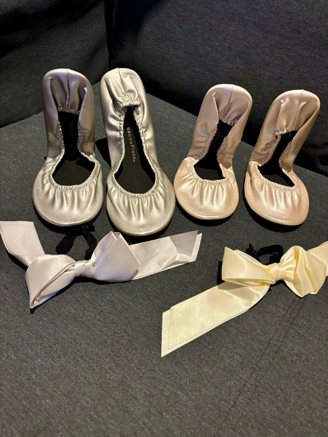 Two pairs of foldable ballet flats with ribbon ties. One pair is ivory and the other is a light silver colour. They are made of a soft, stretchy material and are perfect for weddings, dances, or any occasion where you want comfortable shoes.