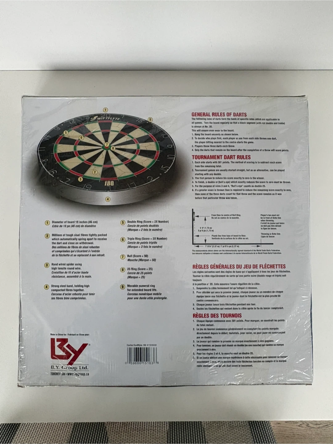 It’s a brand new and sealed SWIFTFLYTE 180 bristle dartboard made from sisal fibres and is approved for World Dart Federation specifications. The diameter is 18 inches (45 cm).