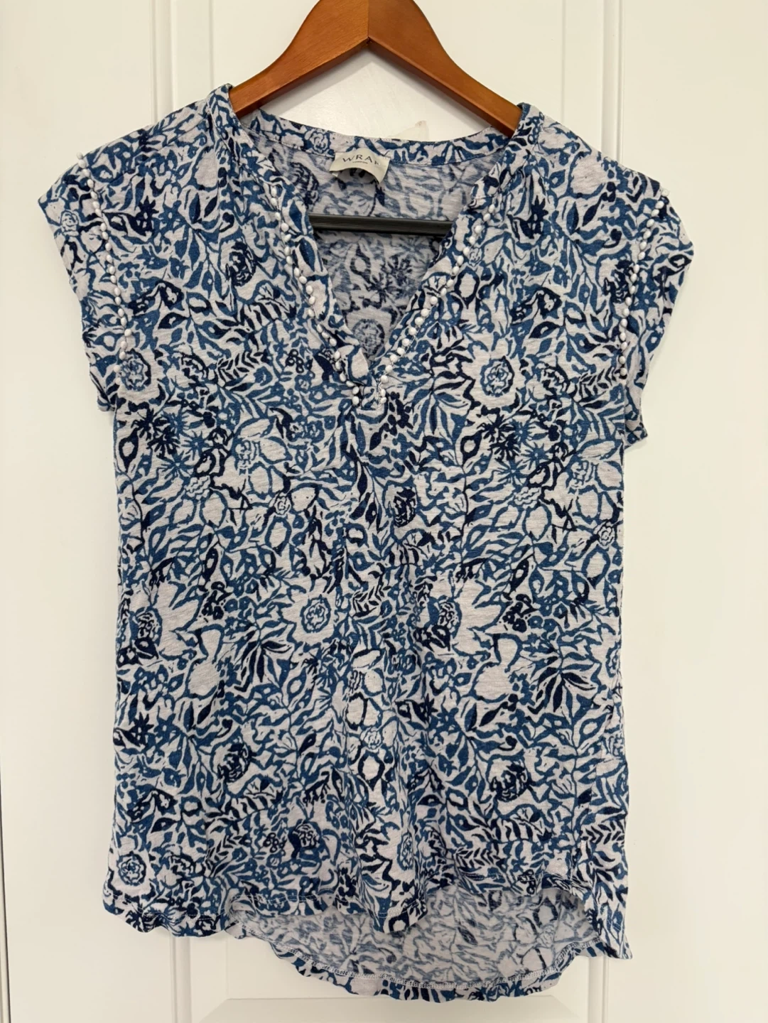 Linen top size women’s medium (10). Great condition! Blue and cream coloured pattern. See my other linen tops. Pick up near Sherbourne and Adelaide st east or sometimes at some TTC stations.