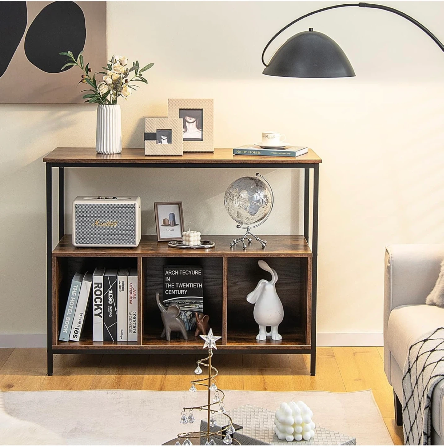 This console table features a rustic wood finish with a metal frame. It's 43.5" wide and 17" deep with a height of 35". The bottom shelf has three open storage cubbies. This piece would be useful for organizing items in an entryway or living space.