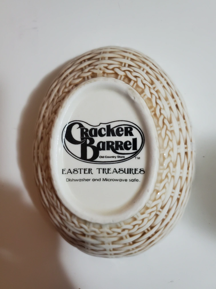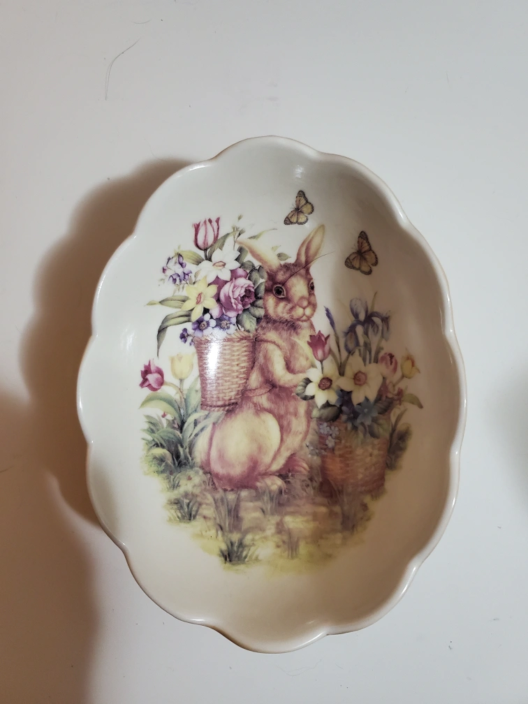 Vintage Adorable Easter dish. Features a bunny with baskets of flowers. Microwave and dishwasher safe. Oval shaped with scalloped edges. Perfect for Easter decor or candy.