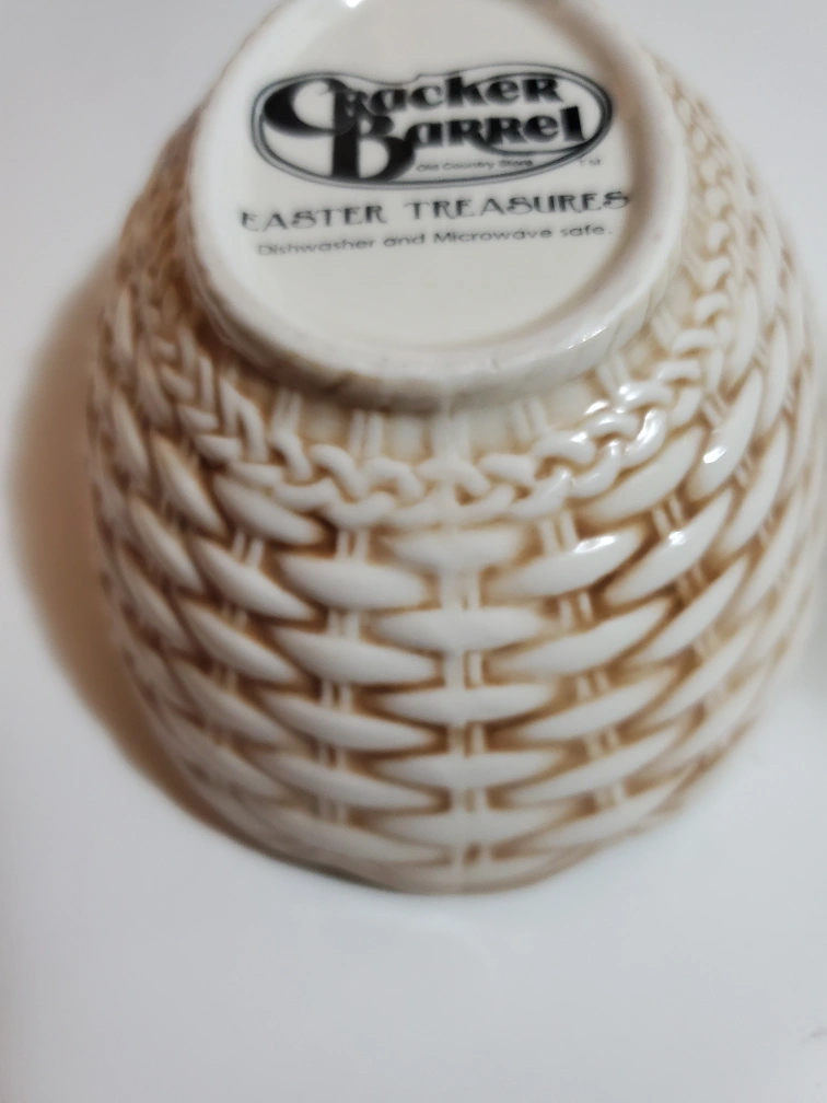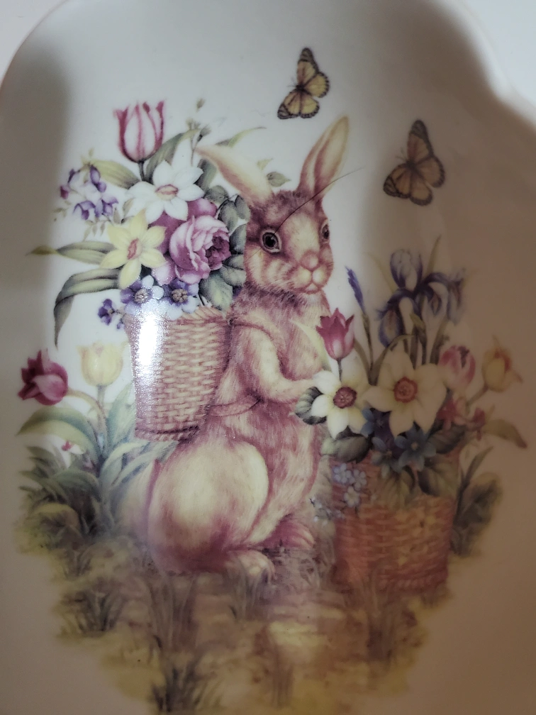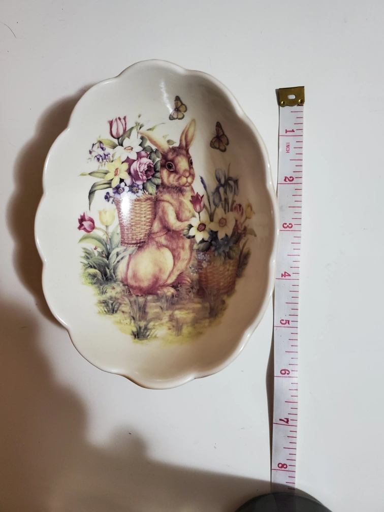 Vintage Adorable Easter dish. Features a bunny with baskets of flowers. Microwave and dishwasher safe. Oval shaped with scalloped edges. Perfect for Easter decor or candy.