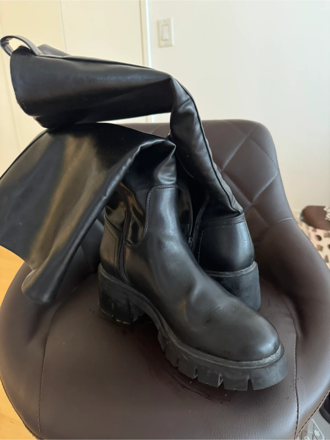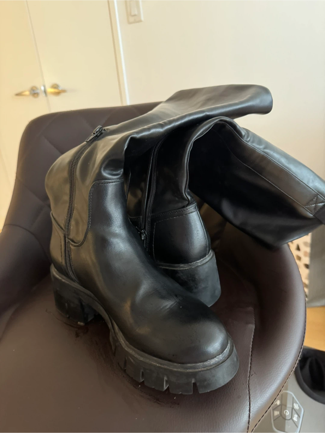 These black knee-high boots feature a side zipper for easy on and off. They have a lug sole and a faux leather finish. Perfect for completing a stylish outfit!