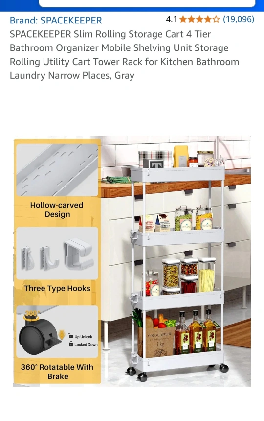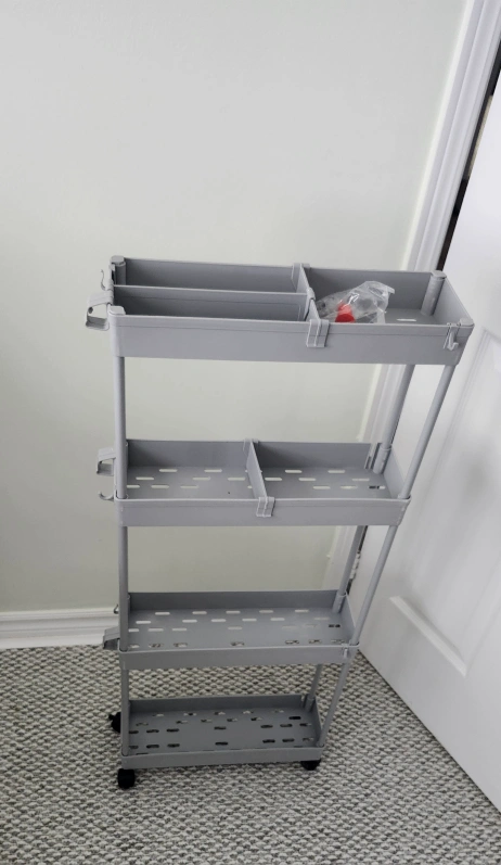 This is a SPACEKEEPER slim rolling storage cart in gray! It's perfect for tight spaces. The cart has four tiers and is great for the kitchen, bathroom, or laundry room.
