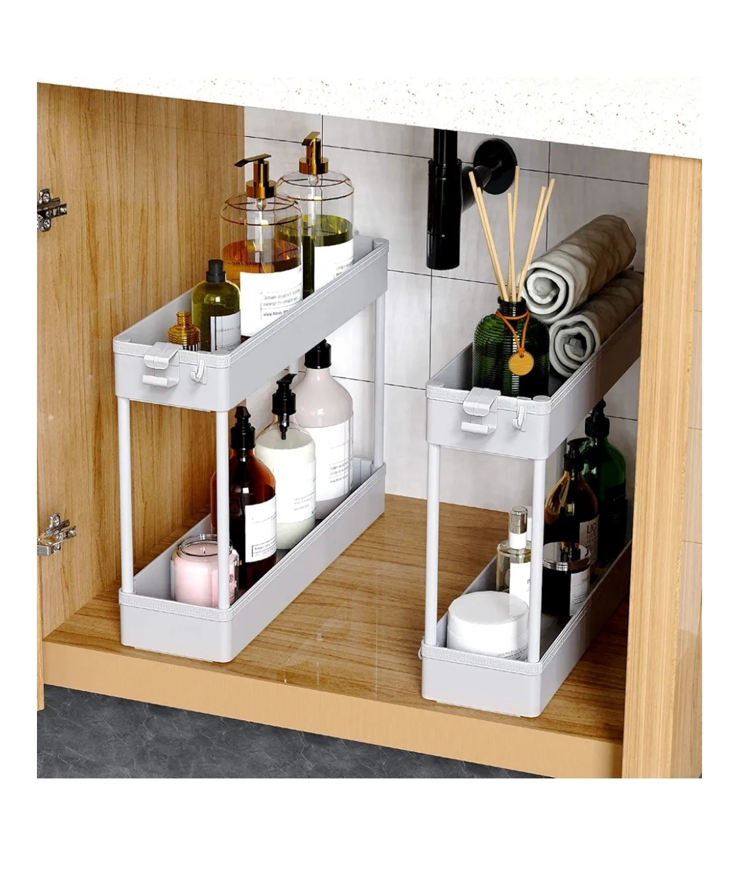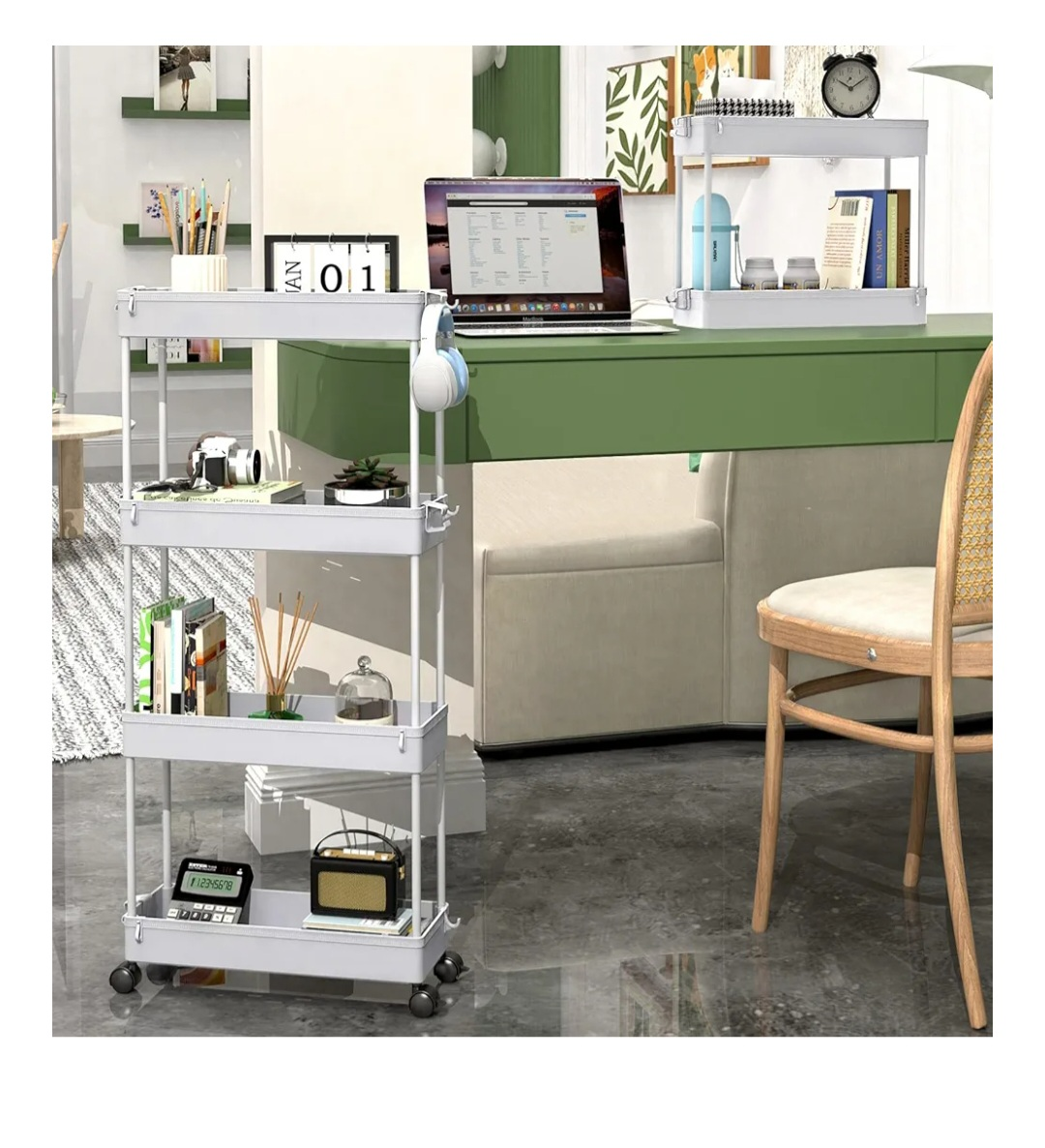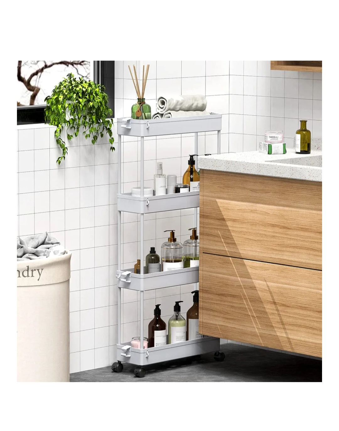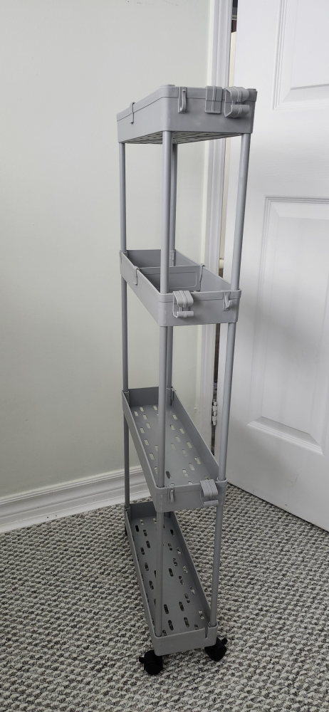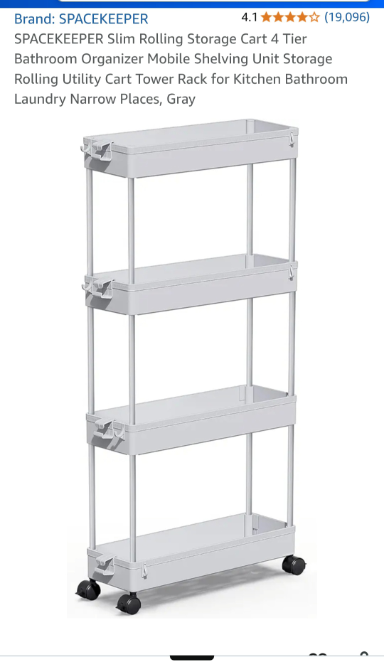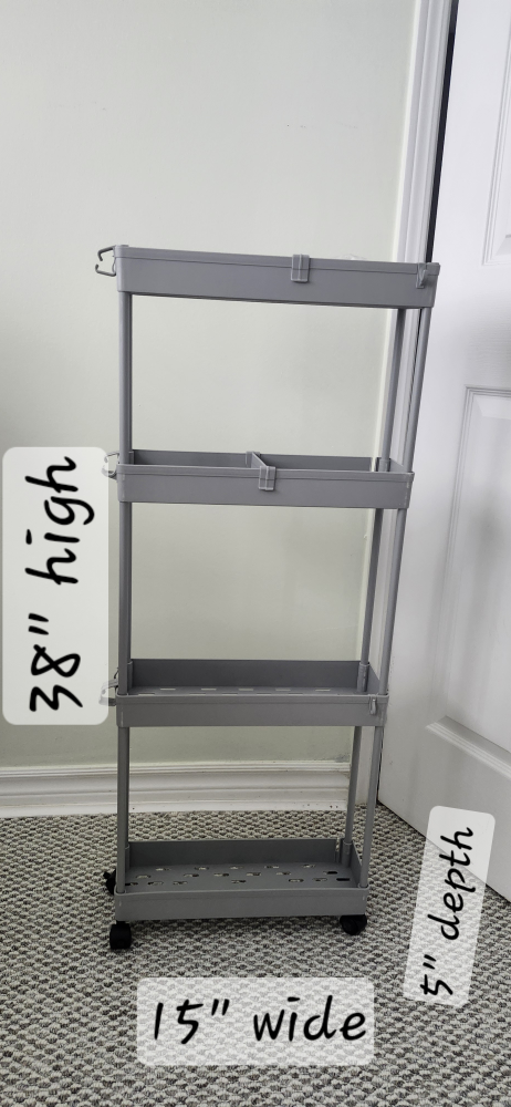 This is a SPACEKEEPER slim rolling storage cart in gray! It's perfect for tight spaces. The cart has four tiers and is great for the kitchen, bathroom, or laundry room.