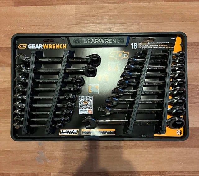This GearWrench 90-Tooth SAE/MM Pro Combination Ratcheting Wrench Set includes 18 pieces with both SAE and metric sizes, offering a versatile range for any job. These wrenches feature a 90-tooth design for a tight 4-degree swing arc, allowing you to work in tight spaces. I'm selling these as they are taking up room in my shop. NEW NEVER USED. I'm pricing this at $150 CAD, but I'm open to reasonable offers. If the ad is up, the wrench set is available.