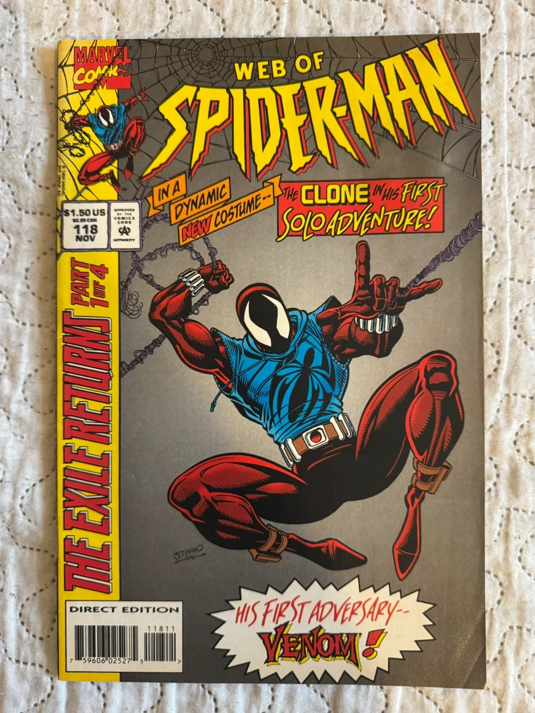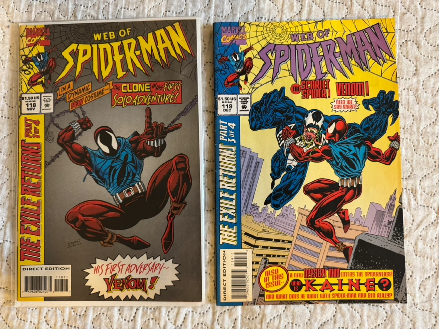 Two key issues of Marvel's Web of Spider-Man comics Features issue #118 First appearance of Scarlet Spider and issue #119 First appearance of Kane. Both Direct edition 1994 Marvel.