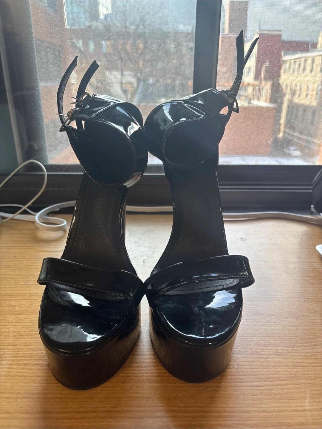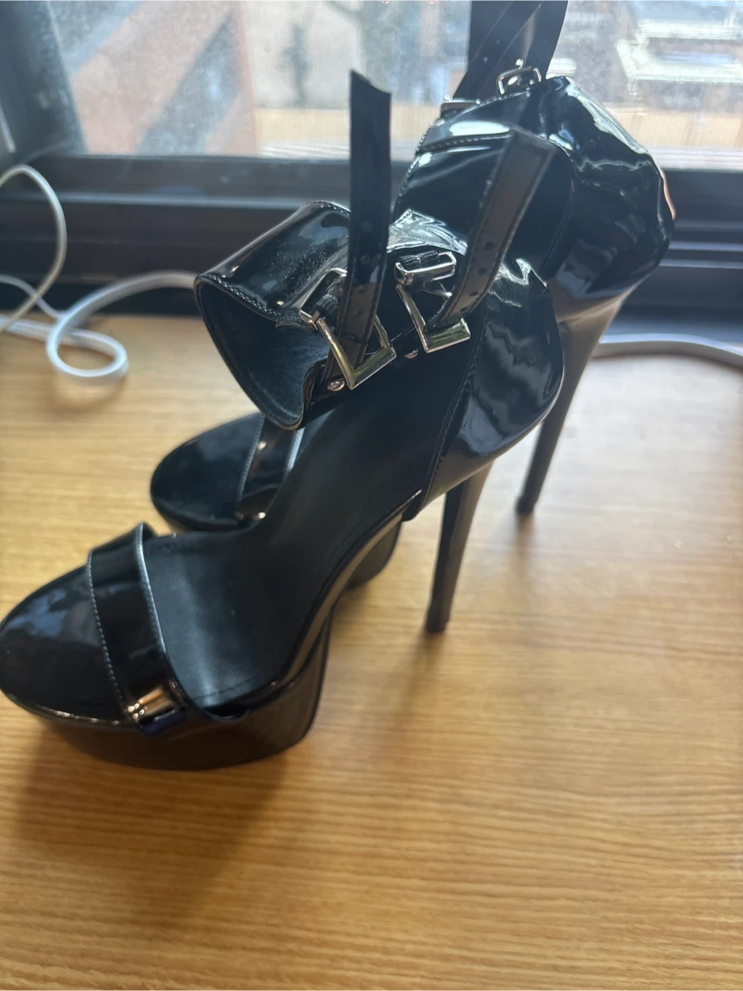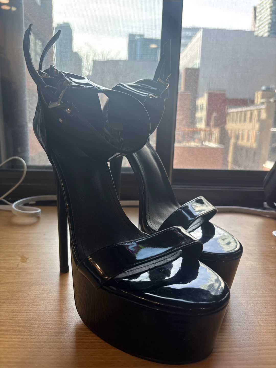 Shiny black patent platform sandals with ankle straps and a high stiletto heel. These heels feature a substantial platform for added height and style. The patent finish gives them a sleek, eye-catching look.