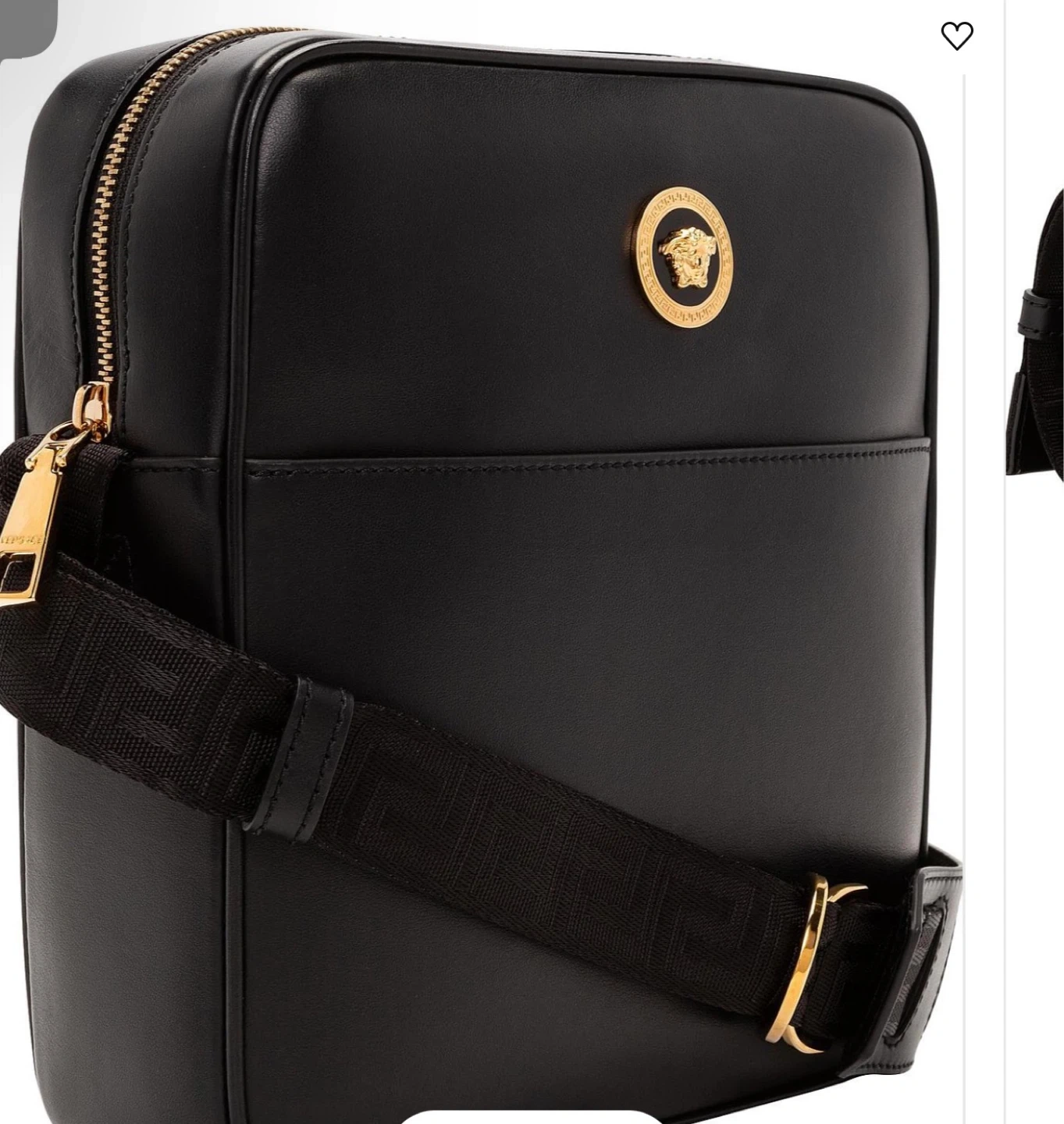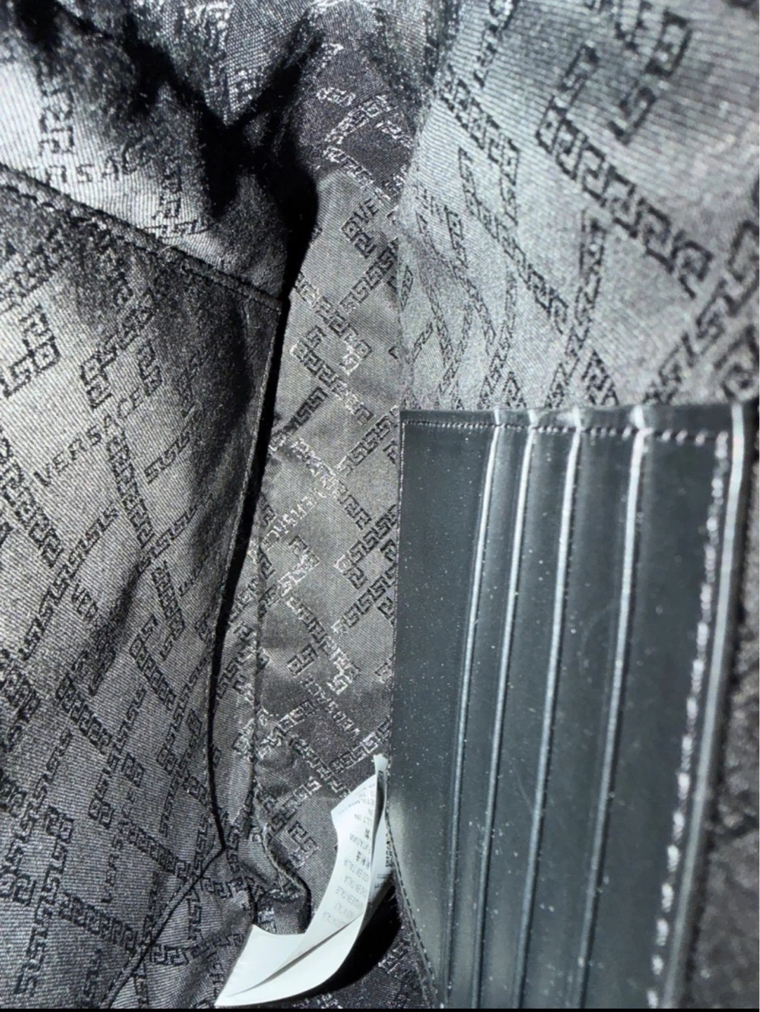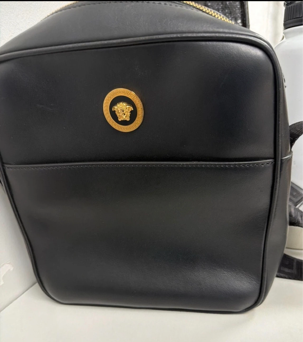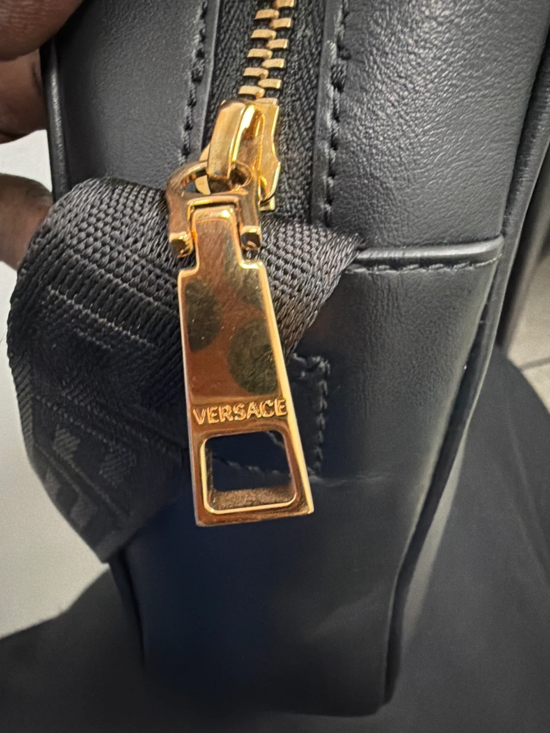 Versace black leather crossbody bag, featuring the iconic Medusa emblem. This used bag is in excellent condition, ready to add a touch of luxury to your everyday carry