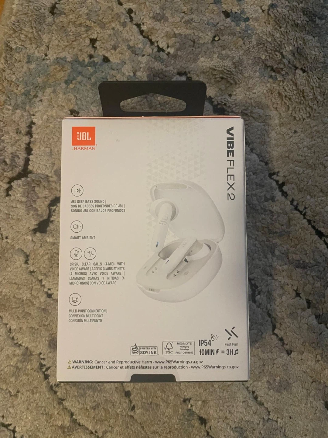 Selling a brand new pair of JBL Vibe Flex 2 wireless earbuds! These earbuds feature JBL Deep Bass Sound and Smart Ambient technology for crisp, clear calls. They have a multi-point connection and are IP54 rated for water and dust resistance. The box is included