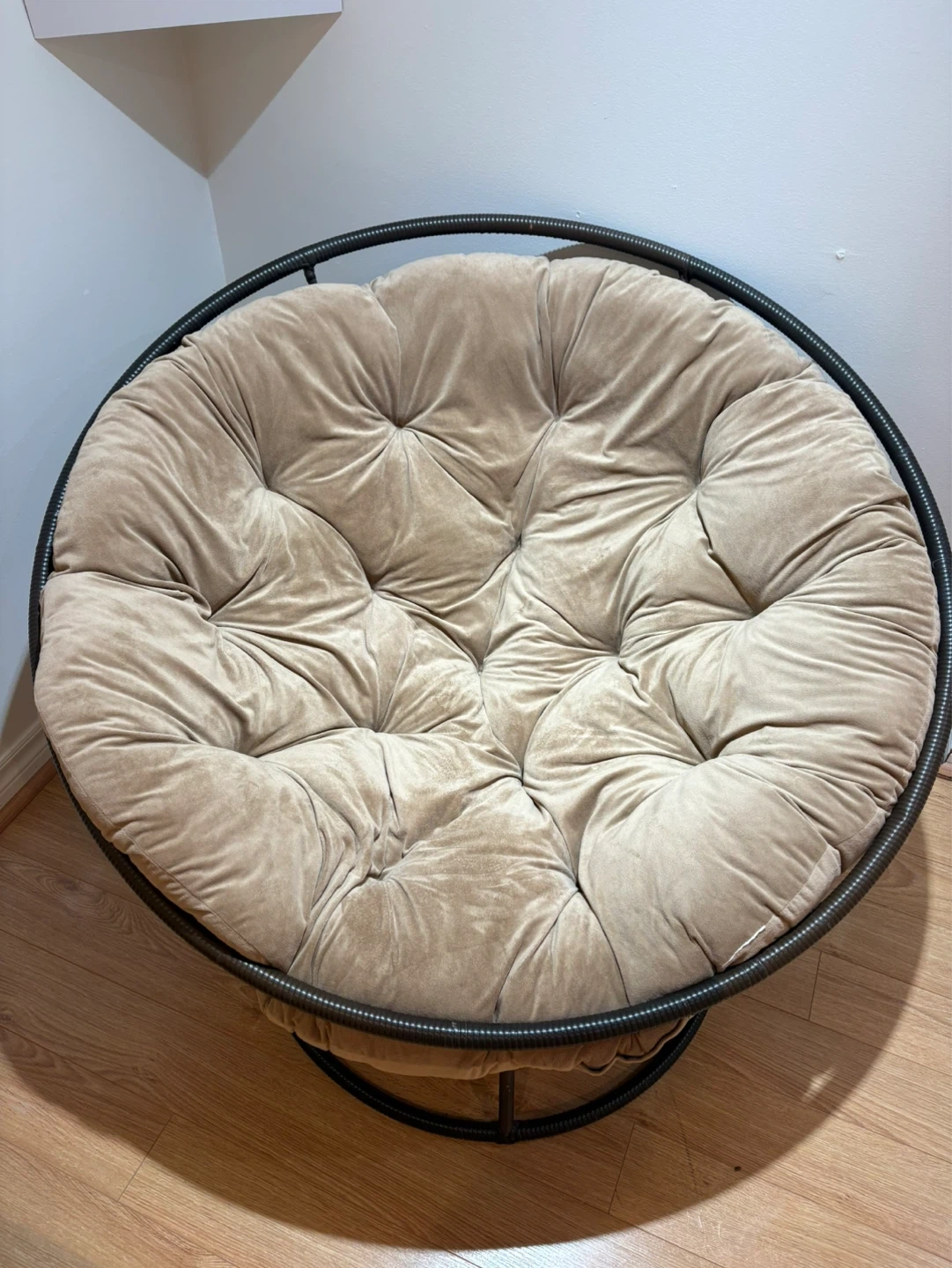 Plush tan papasan chair with a tufted cushion. It has a durable black metal frame. This chair is super comfy for lounging!