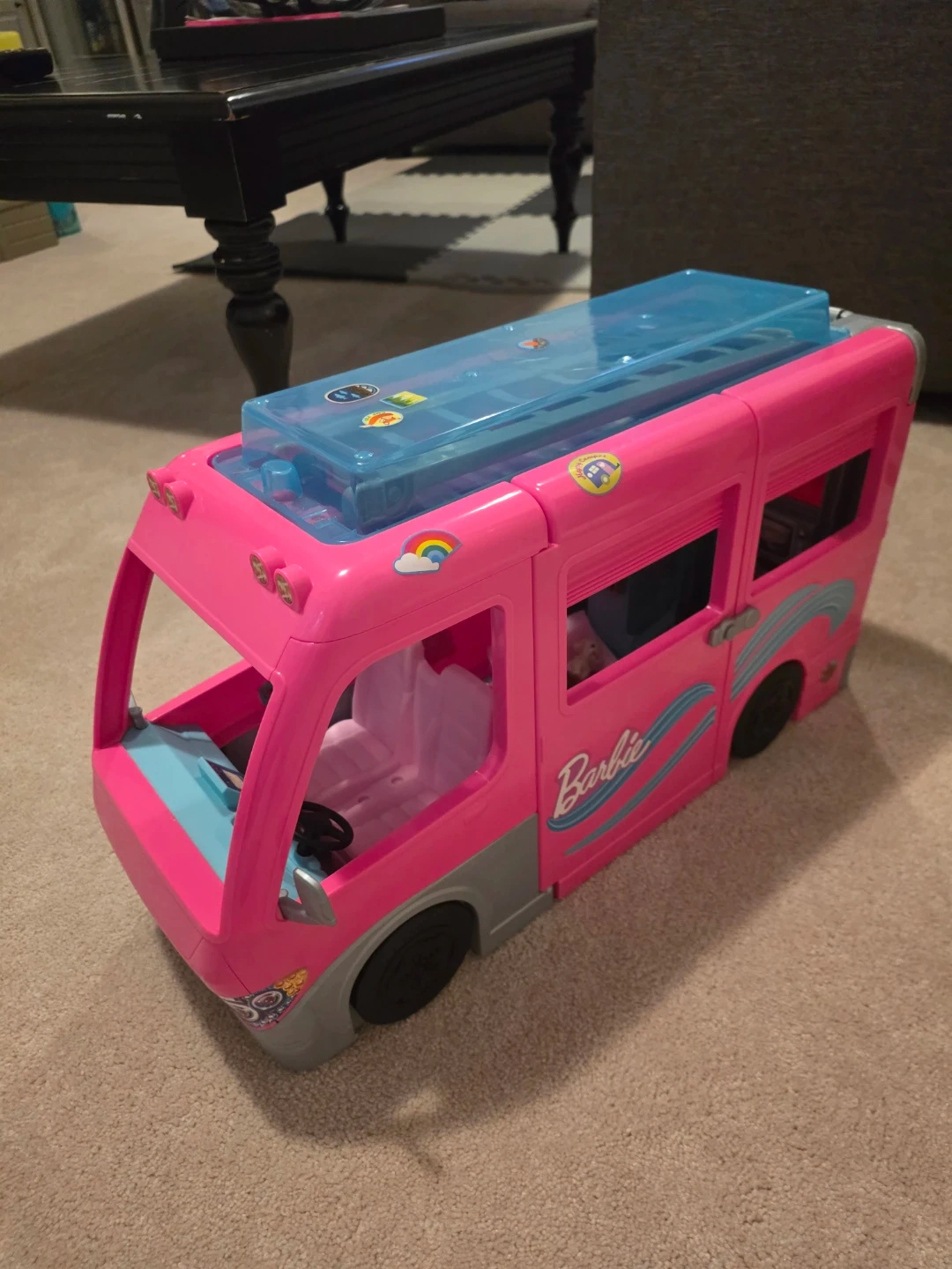 This is a pink Barbie camper van toy. It features a blue transparent roof section and fun decals. Suitable for imaginative play!