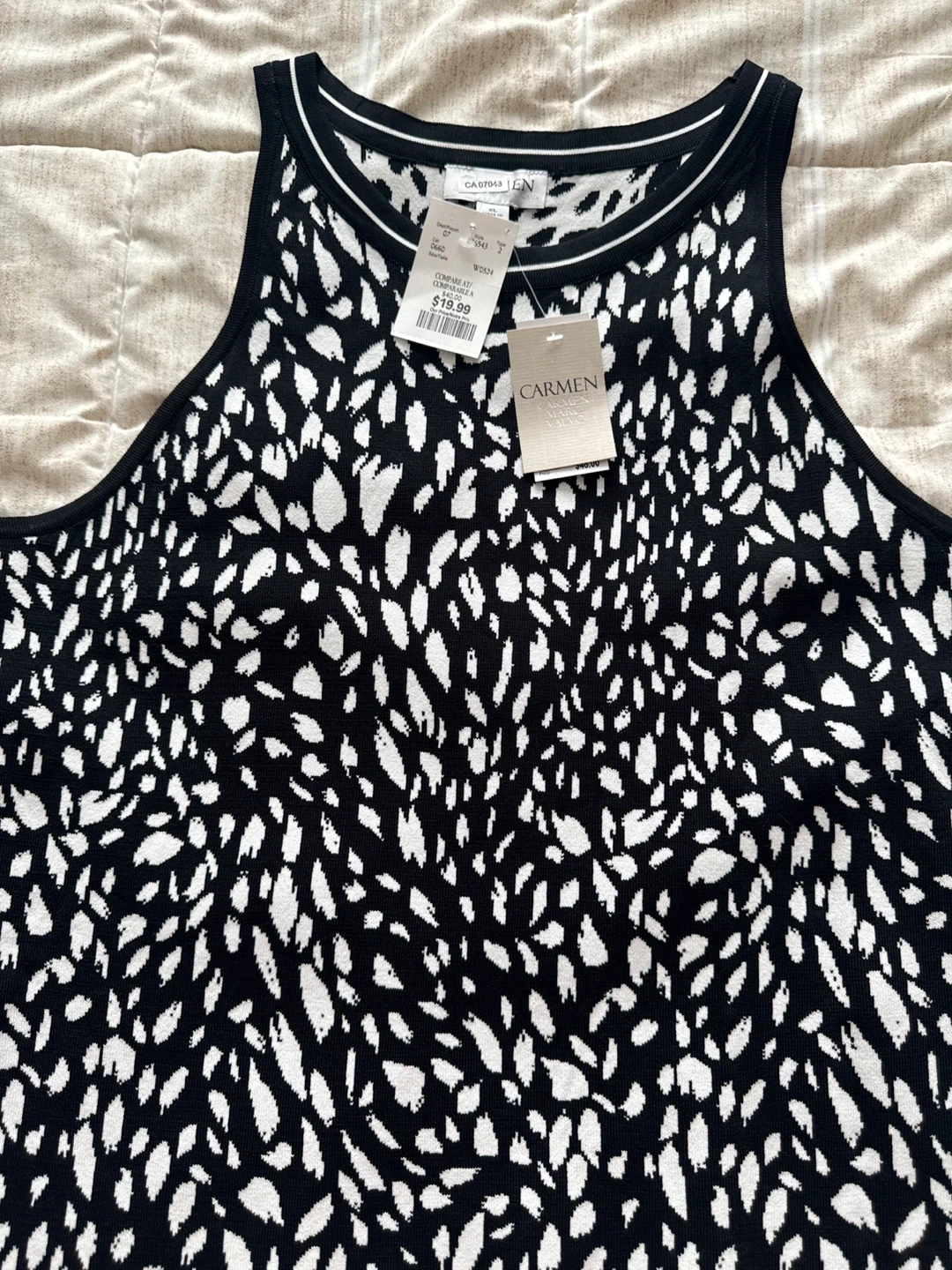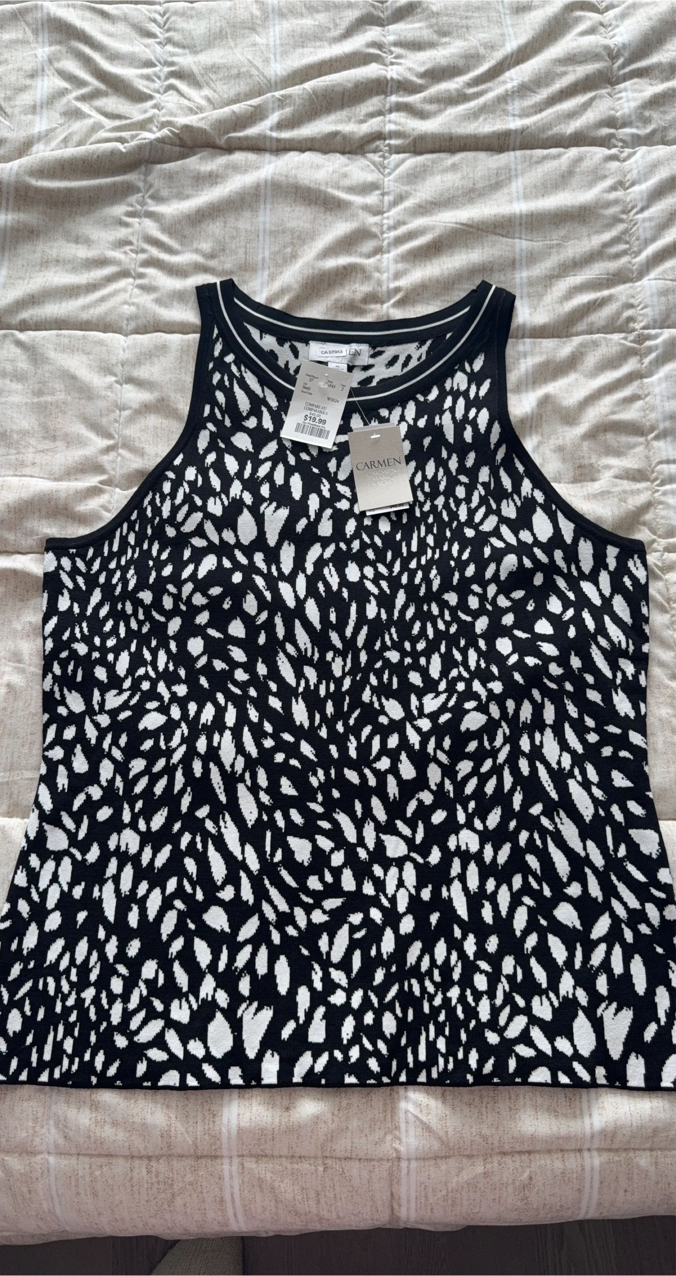This Carmen knit tank top features a bold black and white abstract print. It's a sleeveless style with a round neckline. Perfect for layering or wearing on its own!
