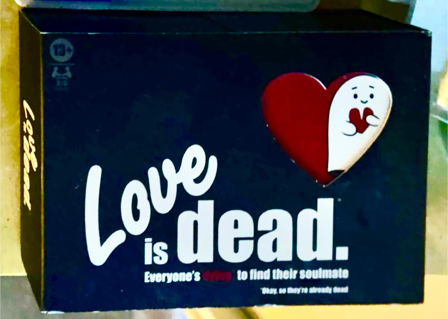 Love is Dead board game, for ages 13+. It's a game for 2-5 players. Everyone's trying to find their soulmate, okay, so they're already dead! Brand new!