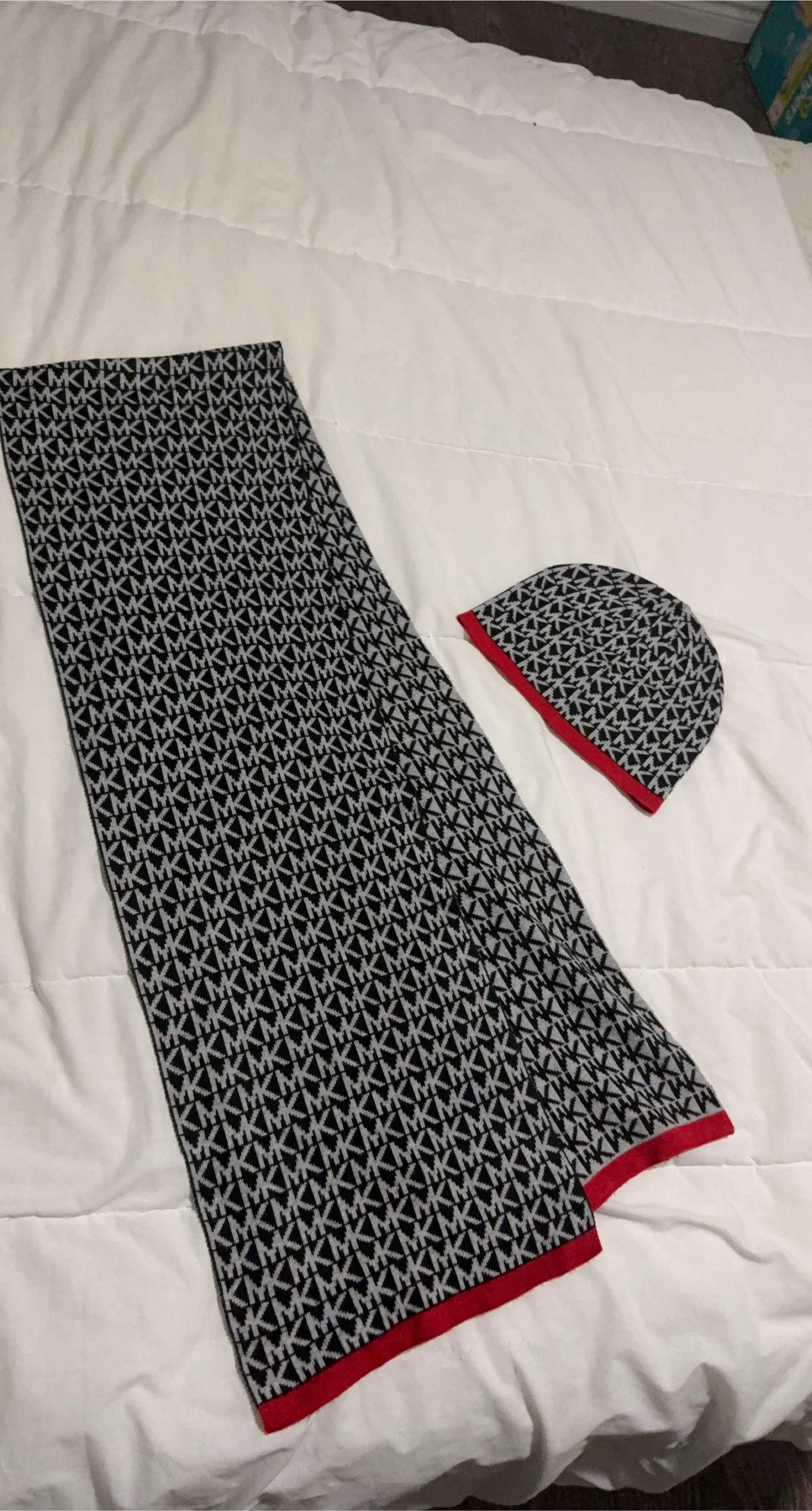 Cozy Michael Kors scarf and hat set! The set features the MK logo pattern in black and grey with a red trim. Perfect for keeping warm and stylish during the colder months