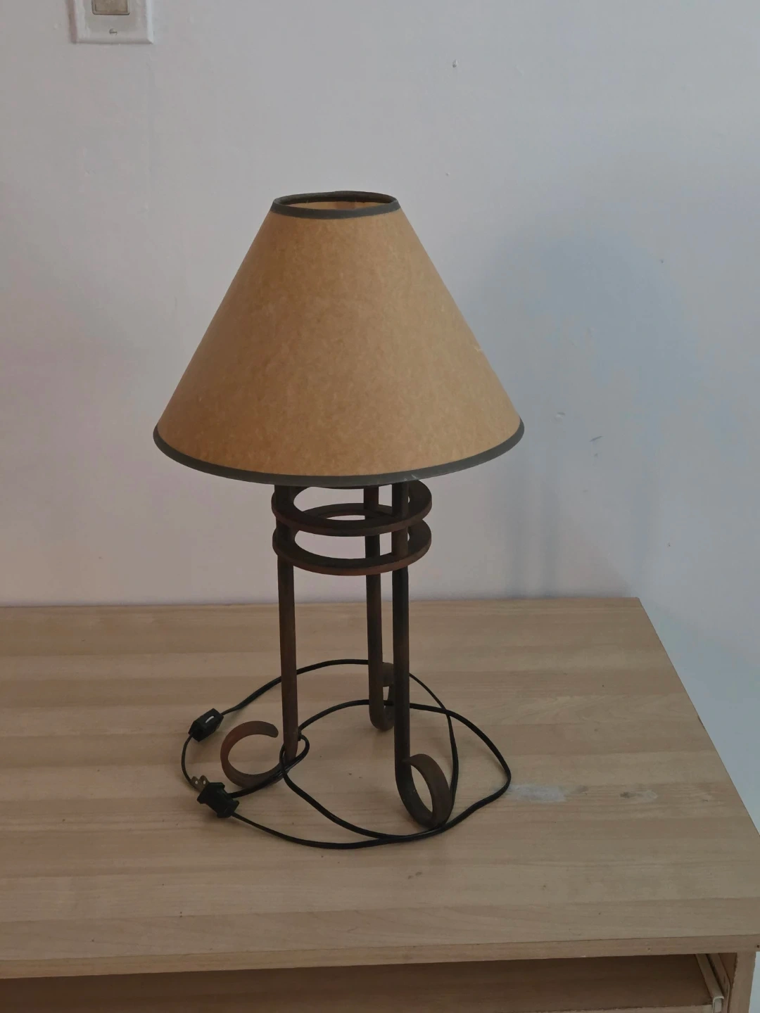 This table lamp features a unique metal coil base with a rustic finish. It comes with a tan, conical lampshade and a black cord with a switch. It's a distinctive piece for adding ambient light.