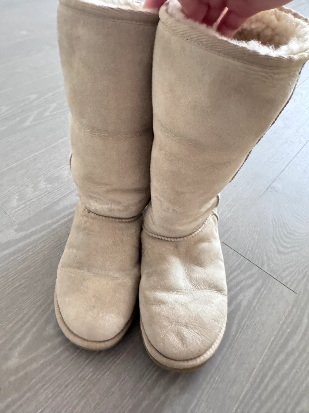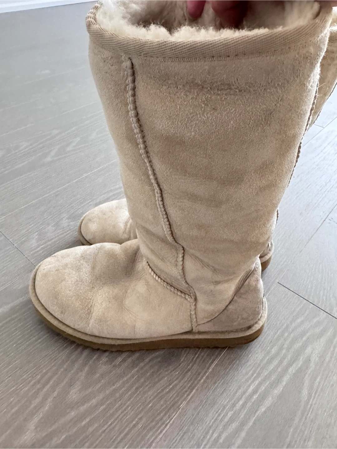 Selling a pair of UGG Classic Tall boots in a women's size 8. They have some wear and could use a bit of cleaning, but they're still cozy and warm for the winter months!