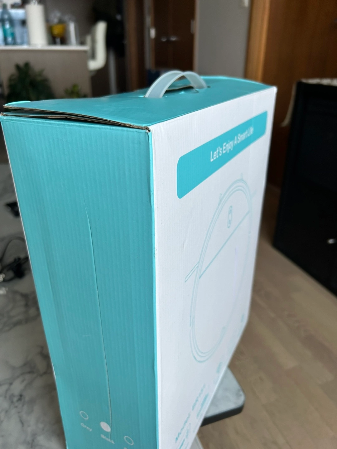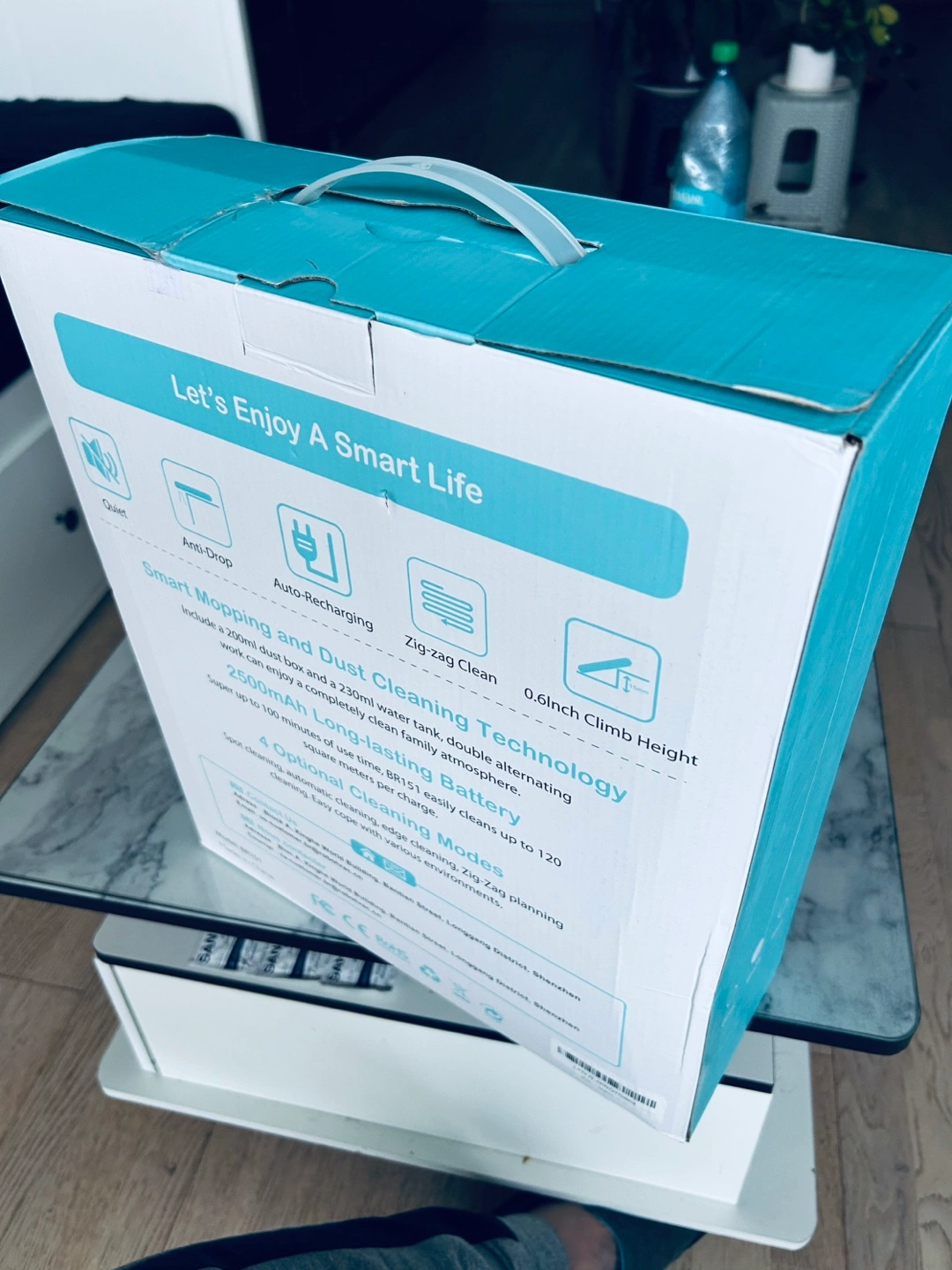 Robot vacuum and mop. Features quiet operation, anti-drop, auto-recharging, zig-zag cleaning, and a 0.6-inch climb height. Includes a 200ml dust box and a 230ml water tank. 2500mAh long-lasting battery. Four optional cleaning modes. Ultra-thin design. Suitable for low-pile carpets. WiFi enabled.
