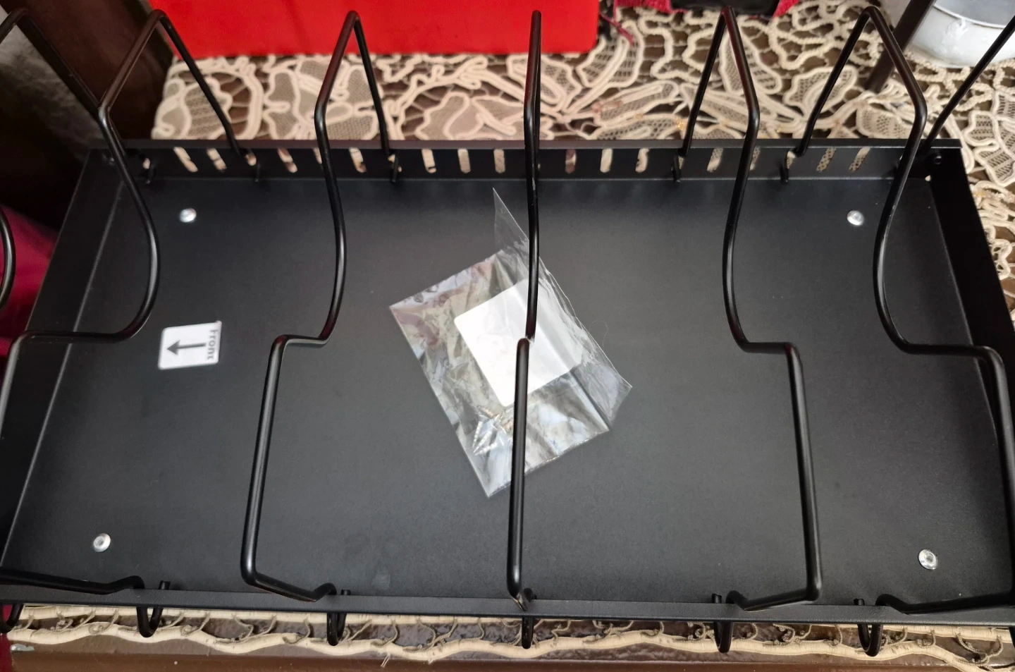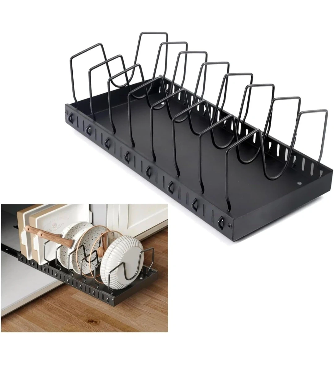 Here's a handy black pull out rack organizer! It's perfect for keeping your plates , pot and lids neatly organized in your kitchen cabinet or on your countertop.