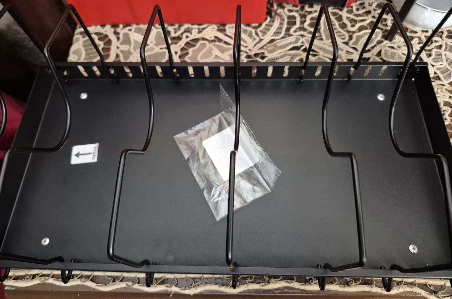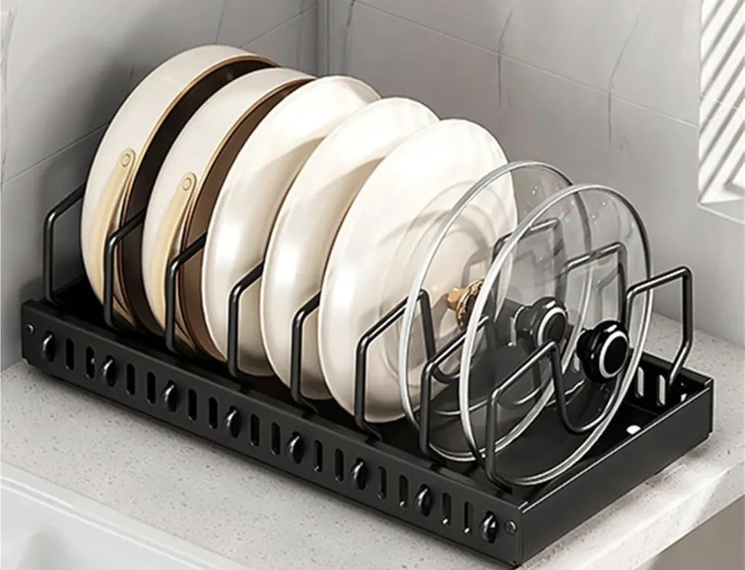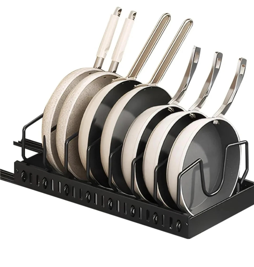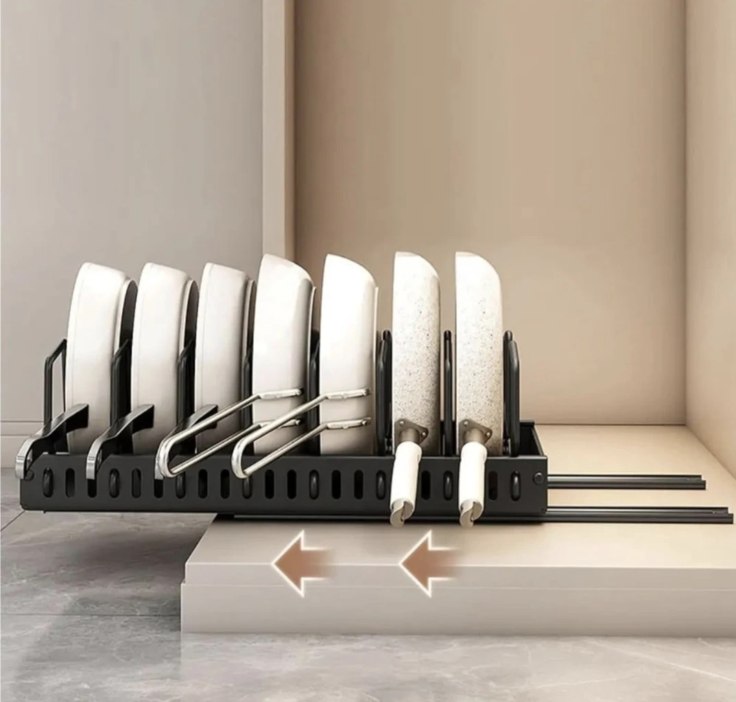 Here's a handy black pull out rack organizer! It's perfect for keeping your plates , pot and lids neatly organized in your kitchen cabinet or on your countertop.