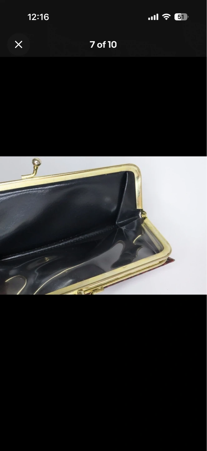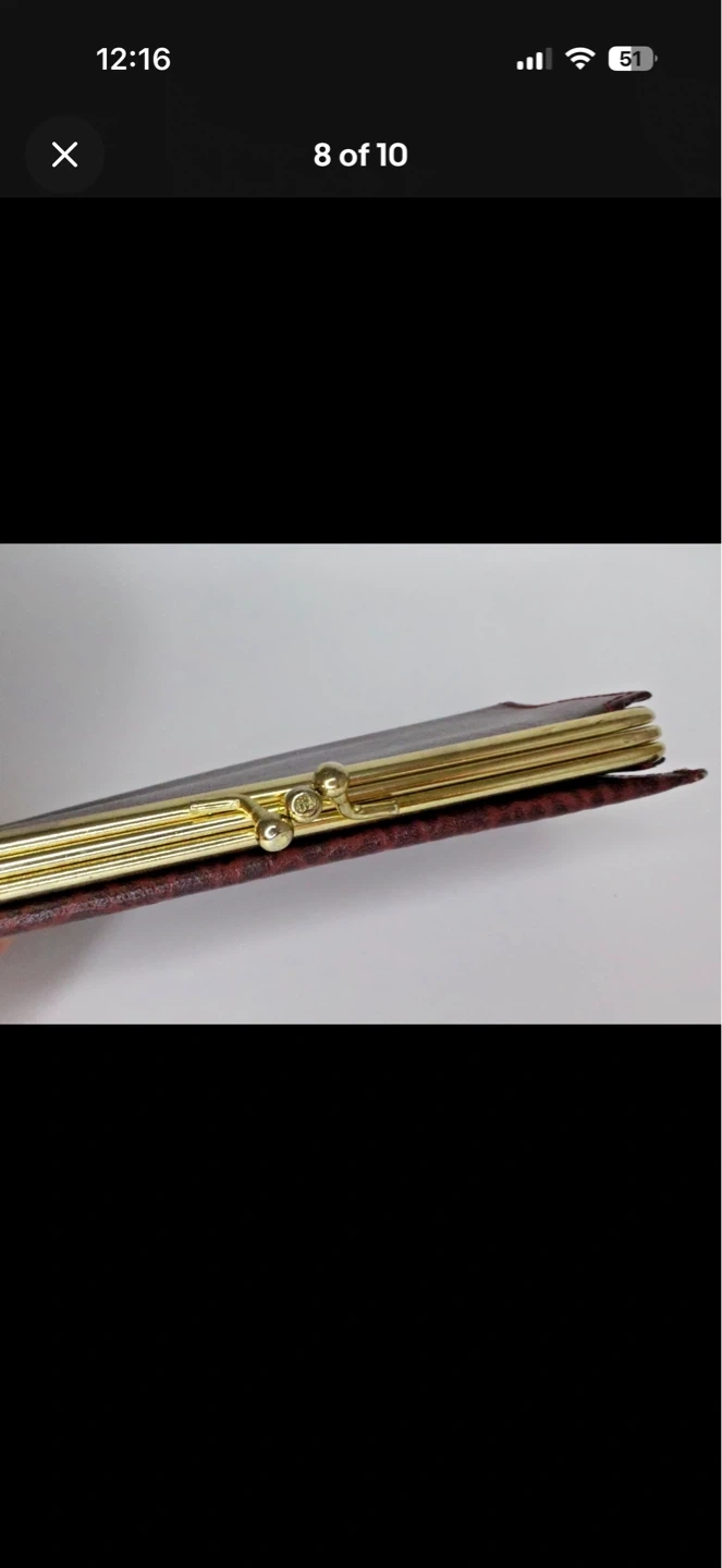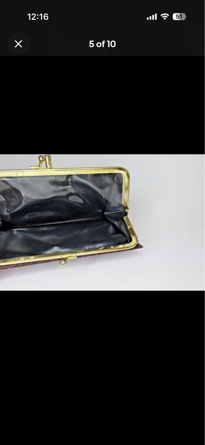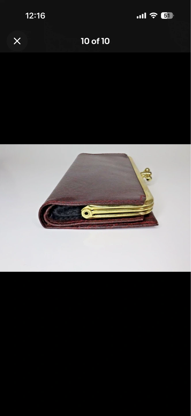 Textured leather clutch wallet in a rich deep burgundy. Kiss-lock metal clasp closure. Sleek rectangular silhouette. Timeless and versatile accessory.