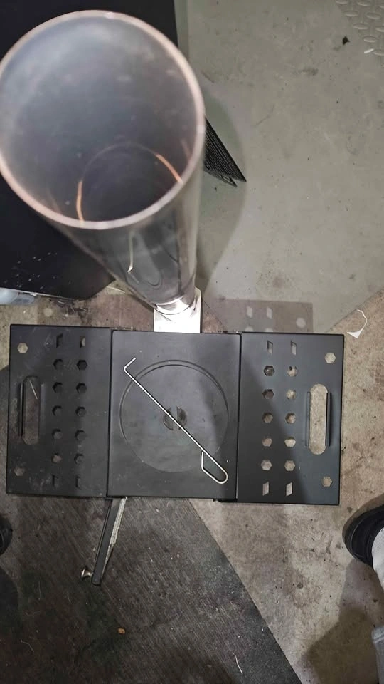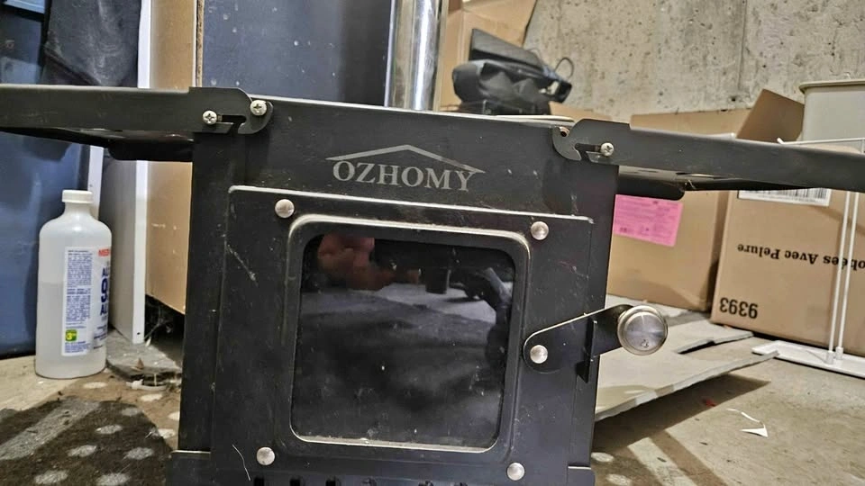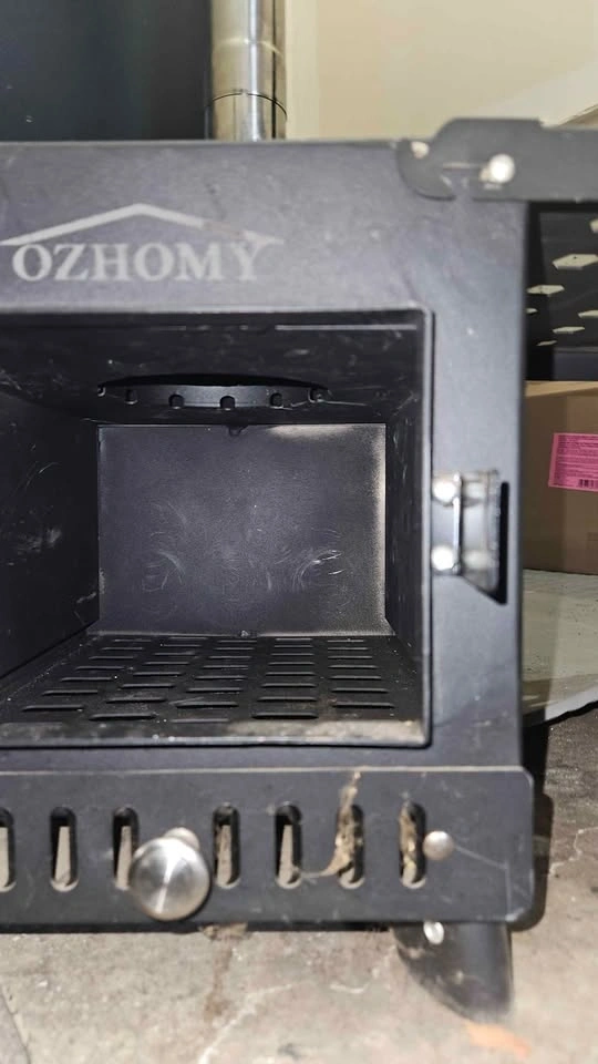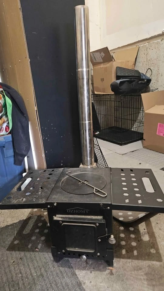 Durable OZHOMY portable wood stove. Has chimney pipe and handy side racks. Great for camping or heating up your tent. Glass door on front. Pick up and cash only.