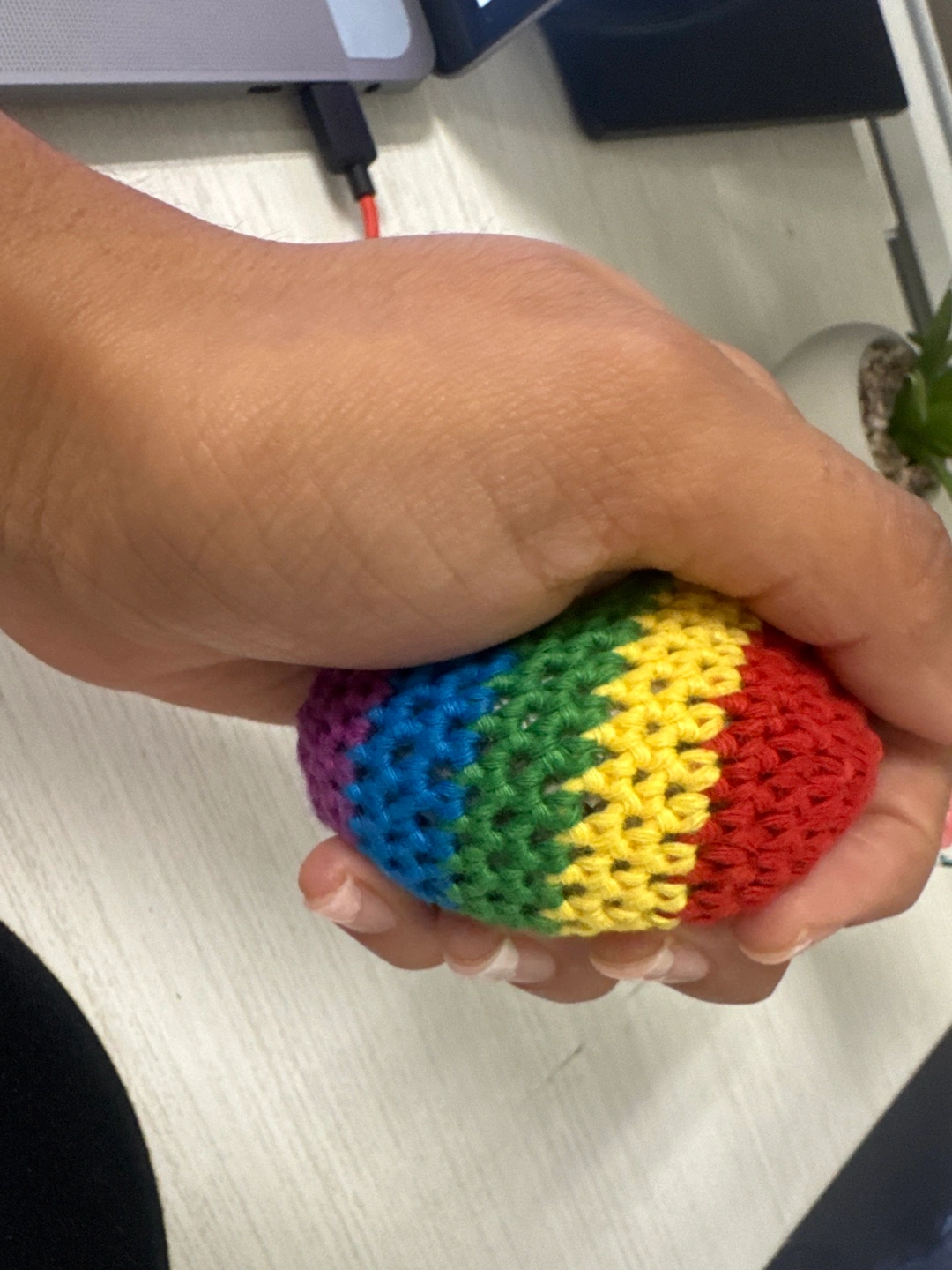 I'm selling a cute, handmade crochet ball with rainbow colours! It's in great condition and perfect for kids or as a decorative item