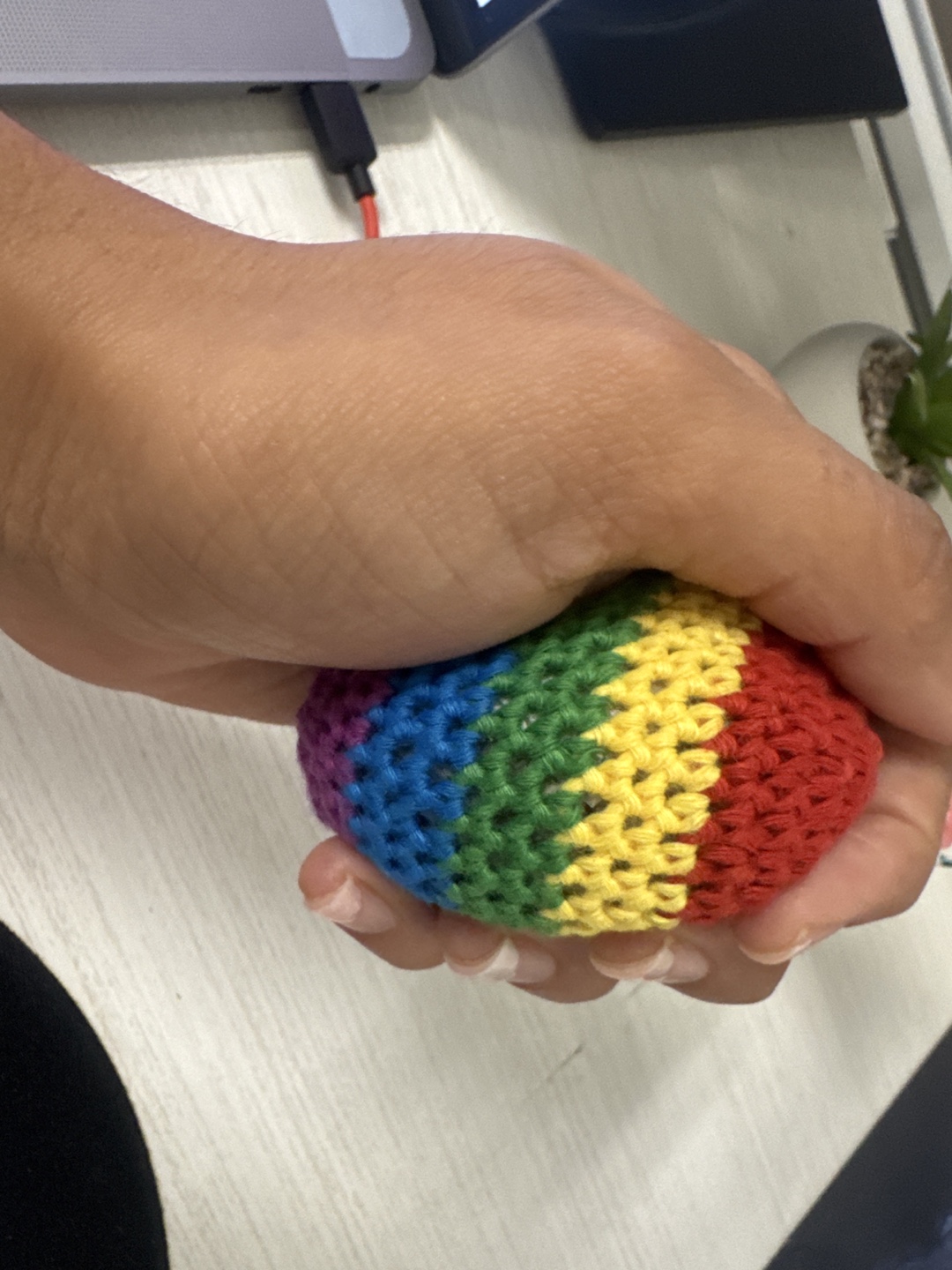 I'm selling a cute, handmade crochet ball with rainbow colours! It's in great condition and perfect for kids or as a decorative item